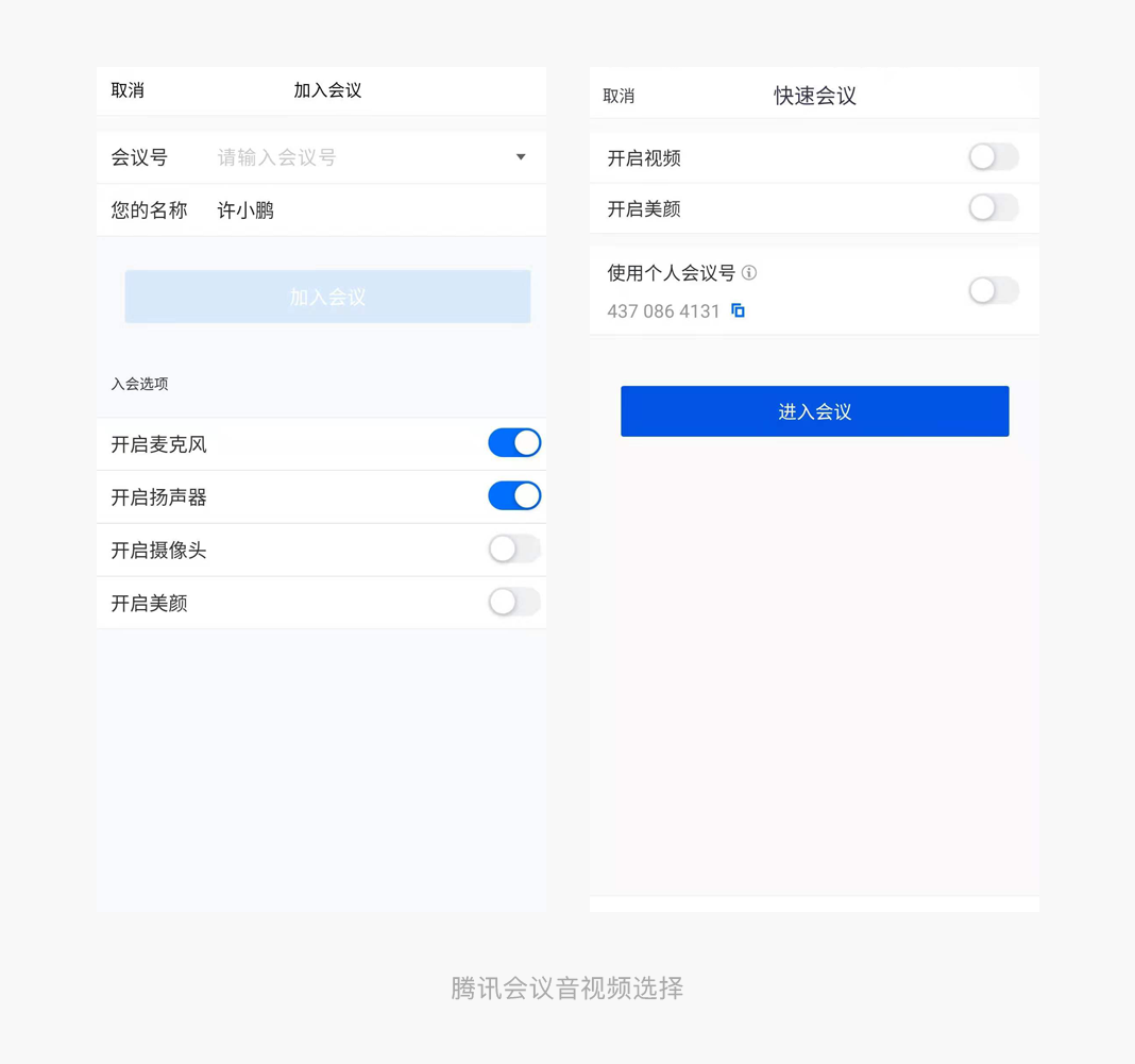 疫情当下我们远程办公/视频学习开始逐渐进入我们的生活和工作中,当在家上网课或者远程会议时,时常会面临家中杂乱的环境入镜或者个人隐私被暴露的尴尬场景。针对这个痛点,在我们输入会议号进入腾讯会议时,会把对视频,音频的开启关闭放在登录页,避免因为在不合适的场景下进入会议室引起不必要的尴尬。