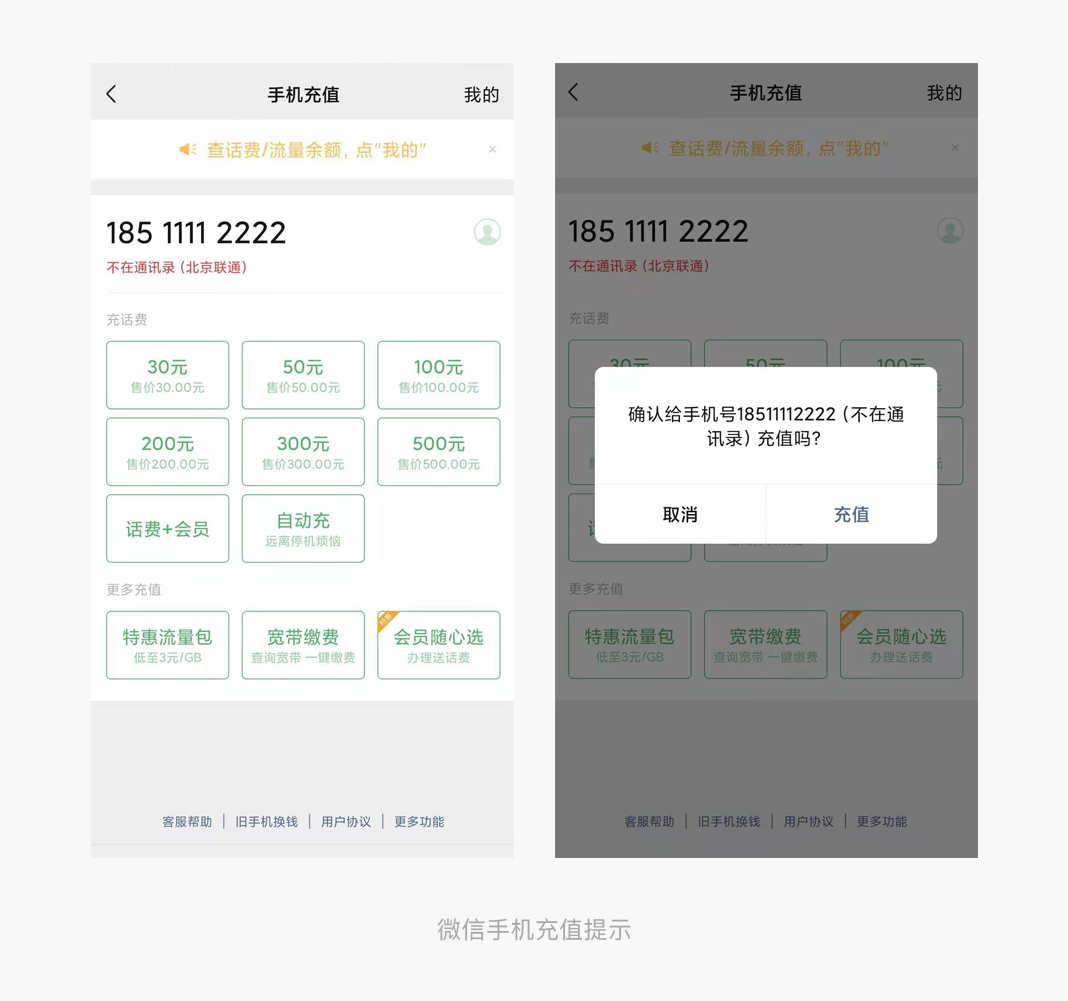 微信手机充值时,当我们输入不在通讯录的号码时会在号码底部标红显示“不在通讯录”提醒用户,选中充值金额后,微信通过弹窗显示手机号(不在通讯录)做二次提醒,极大避免用户因为手机号输入错误而造成金额的损失,最大化的保护用户的权益。