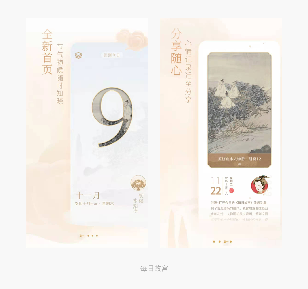 「每日故宫」是故宫博物院出品的一款日历App,它会在每天都为你推送一件故宫的藏品,部分文物还有工艺要点和背景介绍。发现喜欢的文物,还可以记录自己的心情,自动生成精美的分享图片,分享藏品是还可以放大图片细节去分享。里面的设计风格和调性都是符合产品主题满满的中国风。