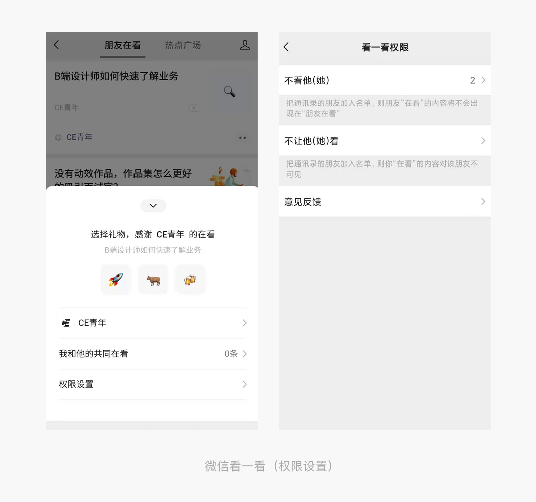 微信「看一看」是用户的“第二朋友圈”,微信好友可以在浏览文章是点击「在看」,文章就会被推送到「看一看」功能中去,并且会让其他好友看见,极大的增加文章的曝光度,但是微信中好友不乏那些低质量或者为公司宣传的「在看」,往往一时间就被这些信息霸屏,当我们不想看某些人的推送文章时可以点击推送人名称【设置权限】不看他,小小细节足于见得微信团队对于社交关系的敏感和深思熟虑,(虽然「在看」这个功能是为人诟病的,但是对于那些创作者和平台来说却可以带来极大的曝光程度和用户流量)
