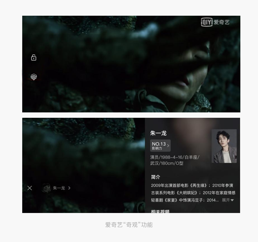 爱奇艺的“奇观”功能,通过整合多项先进技术,支持即时识别和搜索视频画面信息。“奇观”是连接用户和视频之间交互的桥梁,借助AI的识别能力,通过用户一键选择,即可对观影过程中的人物、明星、卡通角色、BGM、台词的识别。当我们在使用爱奇艺时,如果看到喜欢的演员,BGM,台词感兴趣,直接点击左侧的按钮识别就会出现类似百度百科的东西,省去了退出后-打开搜索-查看结果的过程。