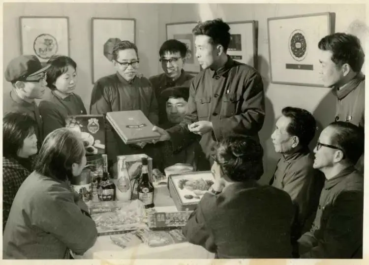 70年代美工组讨论产品设计,站c位正在讲话的是王纯言,后排左三为江爱周(也是凤凰牌香烟设计者),右下角右一为顾世朋,右二为张雪父(永久牌自行车商标设计者)