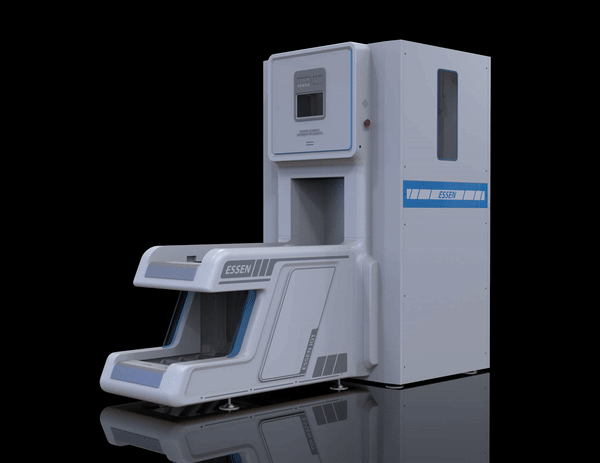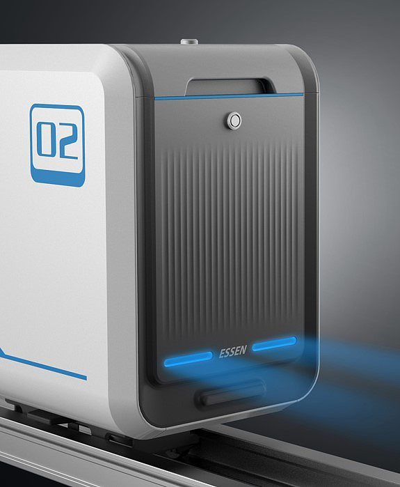 智能中型箱式物流传输系统在设计上沿用相同的视觉语言,以强化品牌统一视觉形象。以人机工程学为基础,将形式与功能最佳化融合。外观上,将面板和传送带连接到一起,形成统一整体性,圆角的运用赋予产品温度感、彰显产品亲和,给使用者亲和的感觉,整体白色的运用使其与医院环境相契合,给人以安全、信任感。