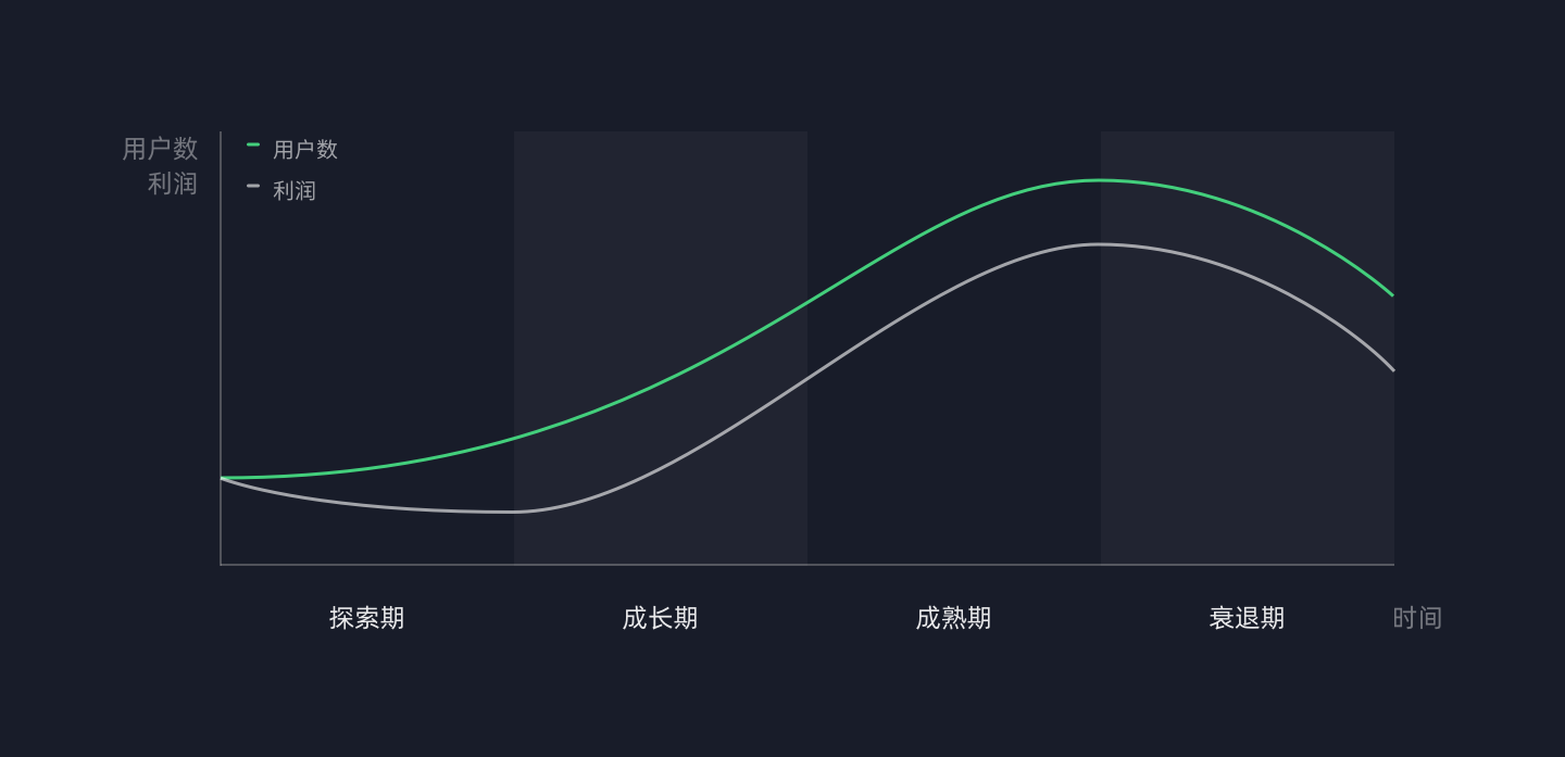 接下来我们从探索期、成长期、成熟期、衰退期四个阶段展开讲一讲用户体验设计师应该关注、发力的点。