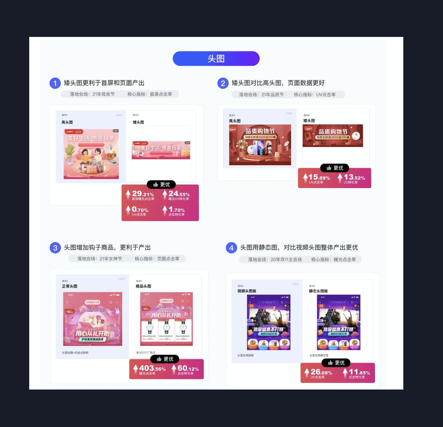 例如:京东设计师,就针对头图,拆分了头图高度、内容、形式等变量,进行了测试,从而得出数据提升规律,进行设计沉淀、复用。