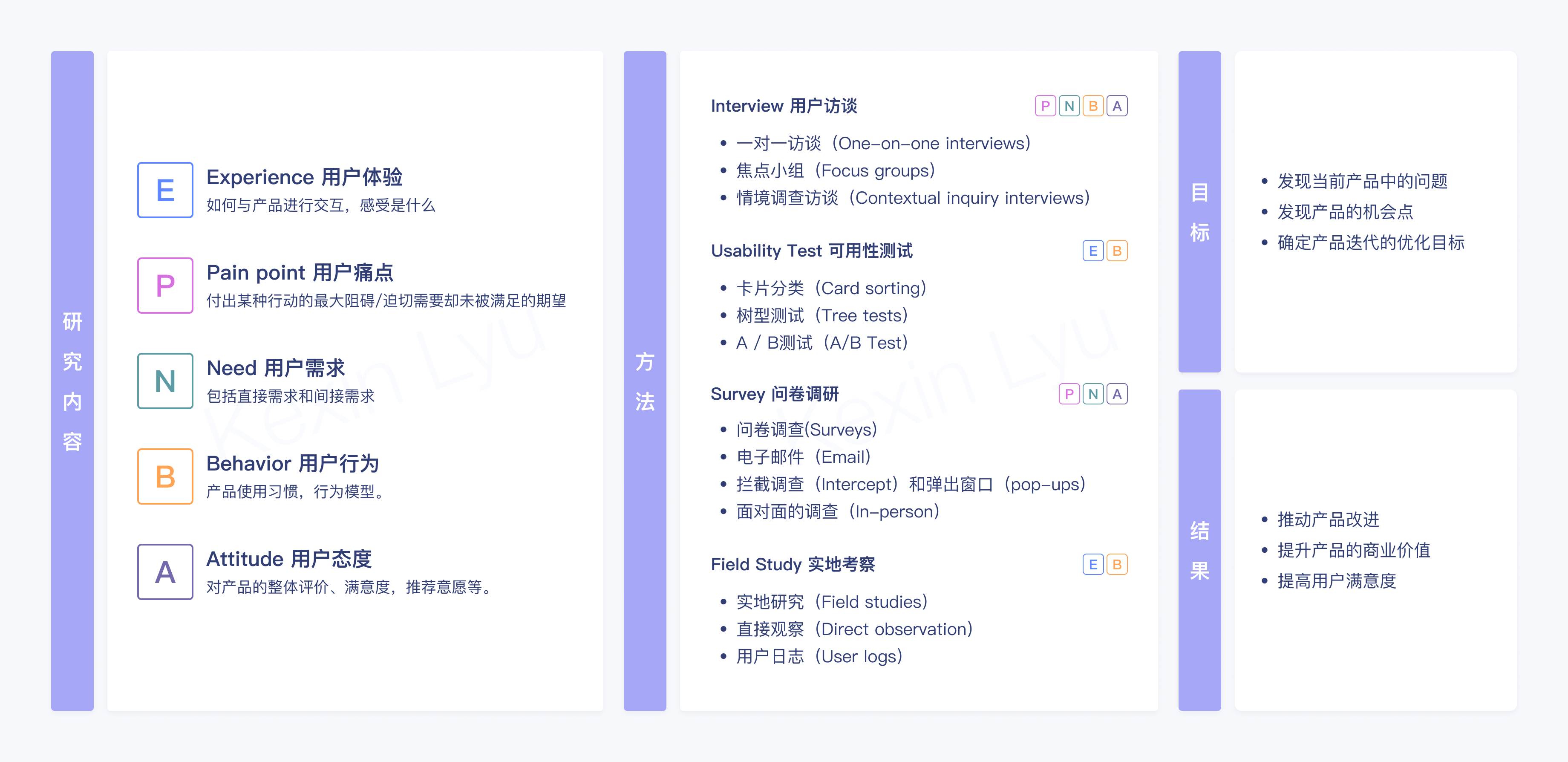 上图是我针对用户研究的内容、方法、目标及价值的一个全面梳理,大家可以根据自己的研究目标,对应找到合适的研究方法。