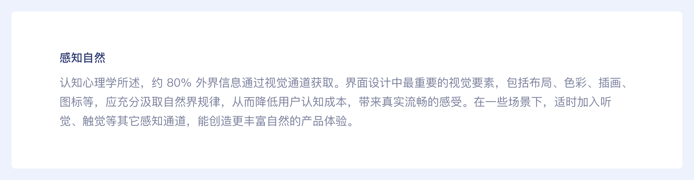很多设计方法都是有理论依据的,是依据大量的实验研究得出的结论。例如,为什么要减少网页的留白,重要的信息为什么要放置在页面左上角等等。提供足够的理论依据,不仅可以帮助设计师轻松理解,为什么要这么设计,也能够帮助他们更好地记忆,下次使用时,能够快速地回忆起来。例如Ant Design设计原则: