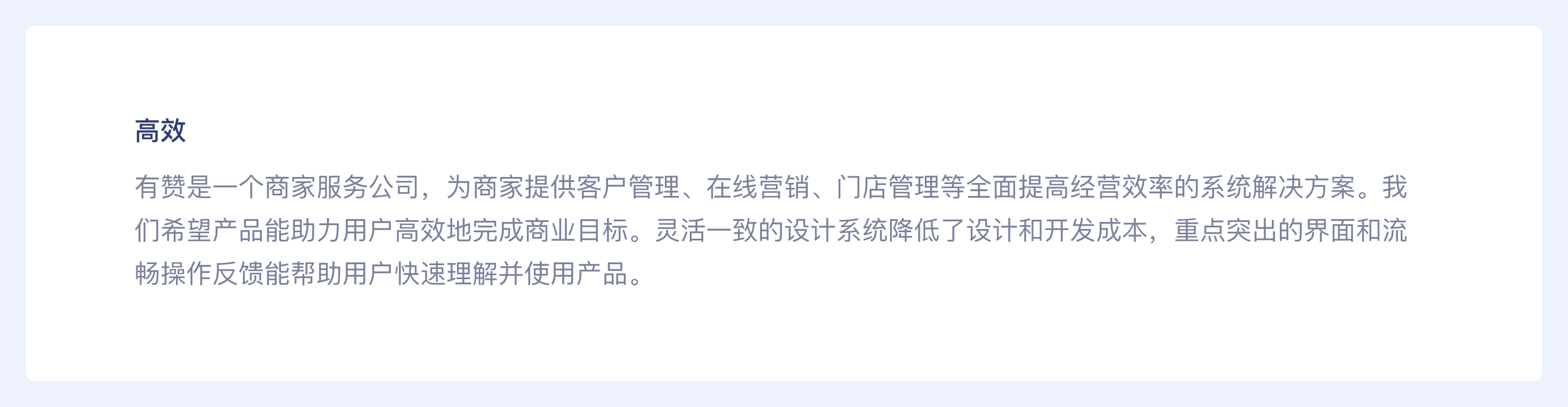 不同类型的产品,追求的核心目标是不一样的。有些产品的目标是商业转化,有些产品的目标是知识分享。无论何时,设计方案都要以实现产品价值为最终目的。一个好的设计原则,应该是产品目标和设计目标充分结合而来的产物。例如有赞设计原则: