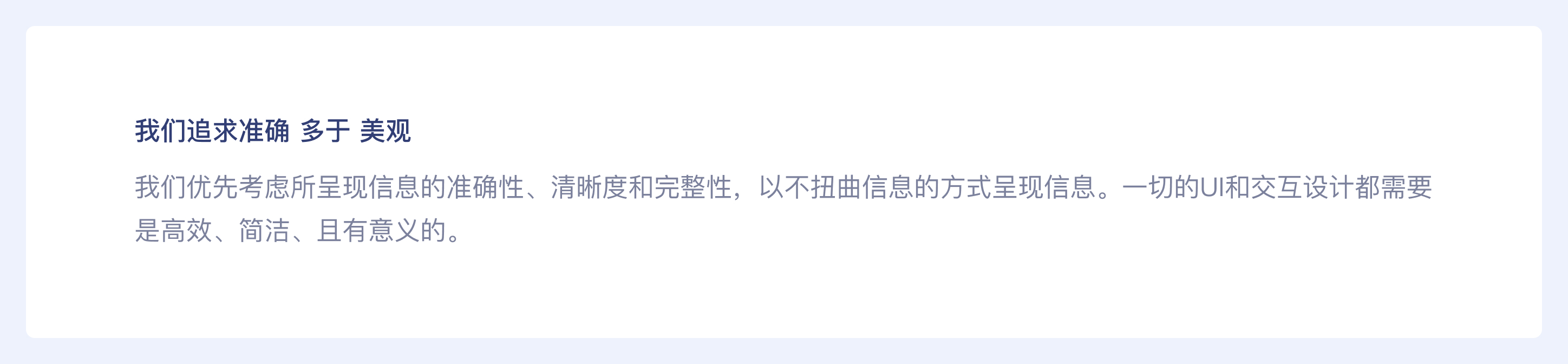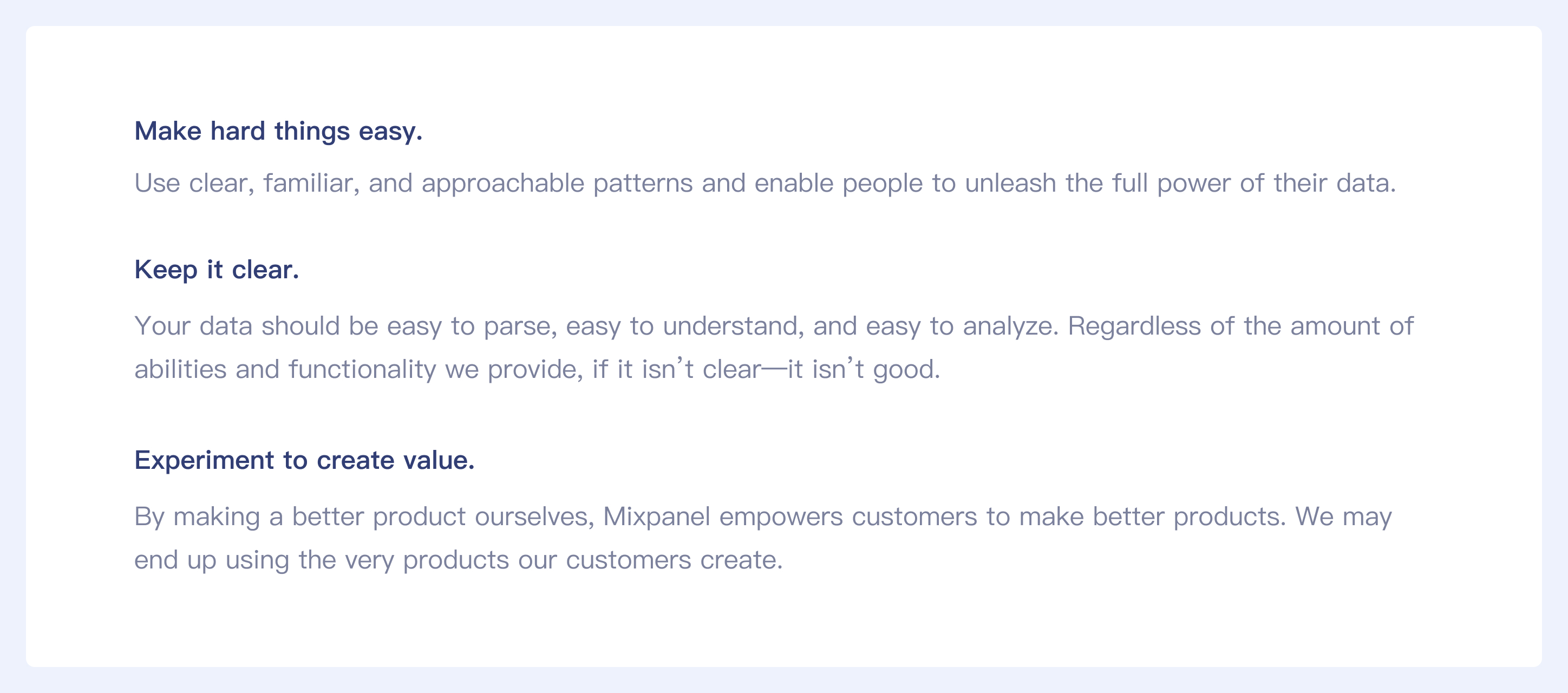 不要简单使用“清晰”“高效”“有意义”这些总结性的词汇,虽然它们作为设计原则没有什么问题,但设计师很难通过一两个词,去找到设计的思路。因此,一些补充说明是很有必要的。可以将原则放到一个特定的产品背景之下,方便设计师理解。例如Mixpanel设计原则: