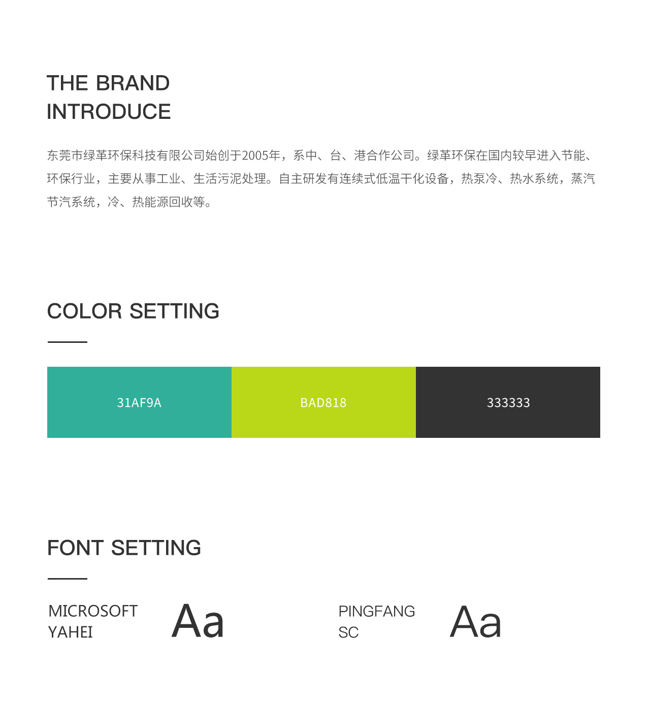 在LOGO设计上,使用了「GREEN POWER」作为标志的主体,表现出绿革在环保行业贡献的力量和决心。其次在标志中央设计了三点水滴的图形,更强化了绿革的环保行业属性和以及品牌的识别性和独特性。
