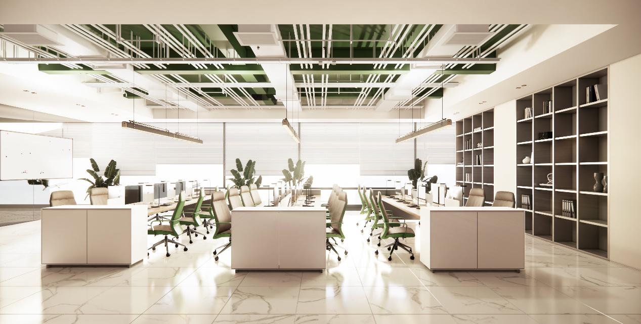 而在开放办公区,在原始天花裸露的基础上刷绿色乳胶漆,这种随性的工业风做法也贴合现下大多数办公室设计潮流。
