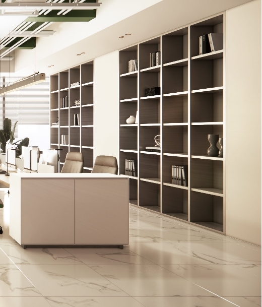 传家定制办公室柜体,一柜到顶的设计十分清爽。开放式柜体和带门柜体可以随情景自由组合,木饰面柜体和拉丝不锈钢柜体的搭配彰显不凡品位。