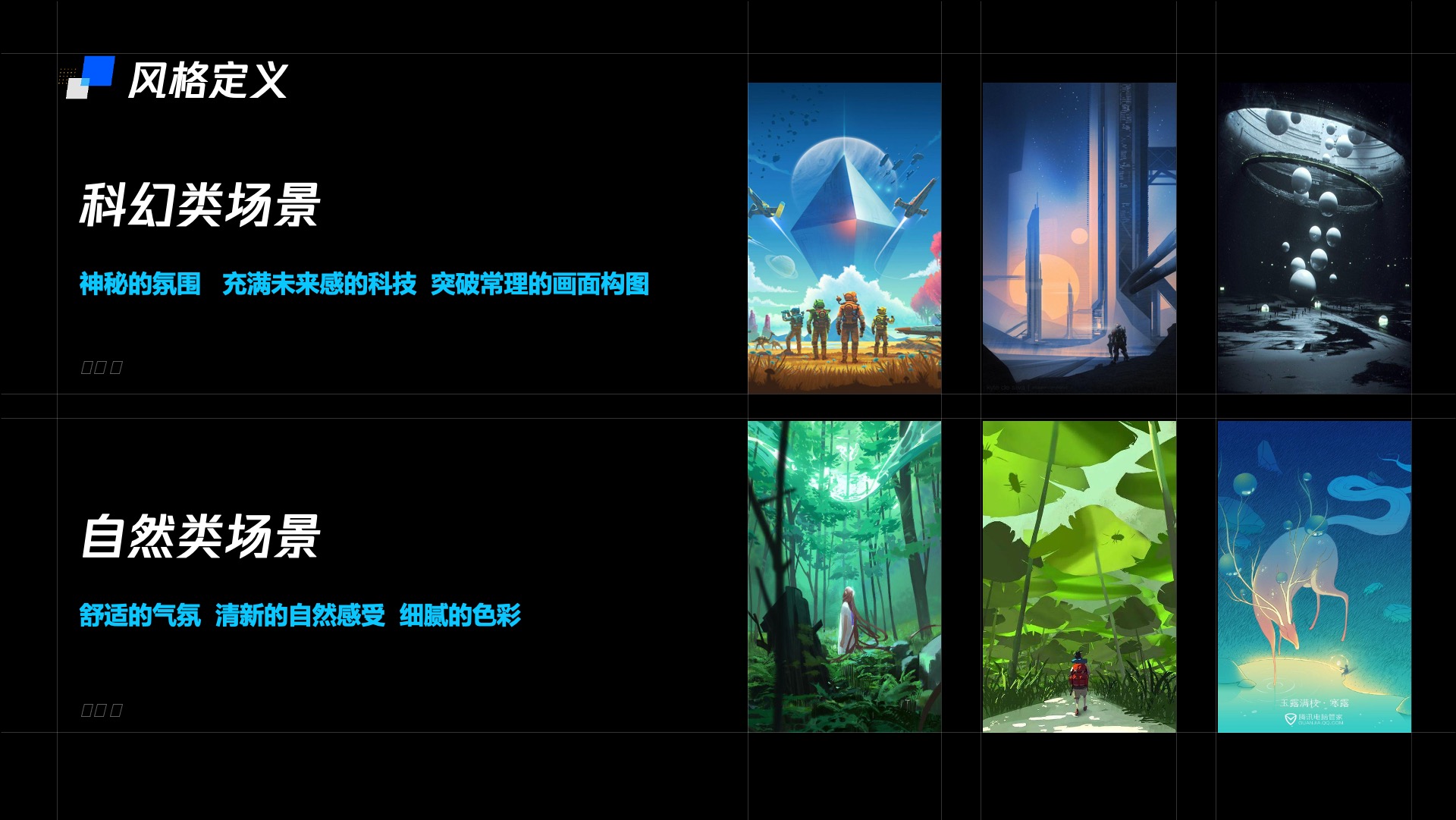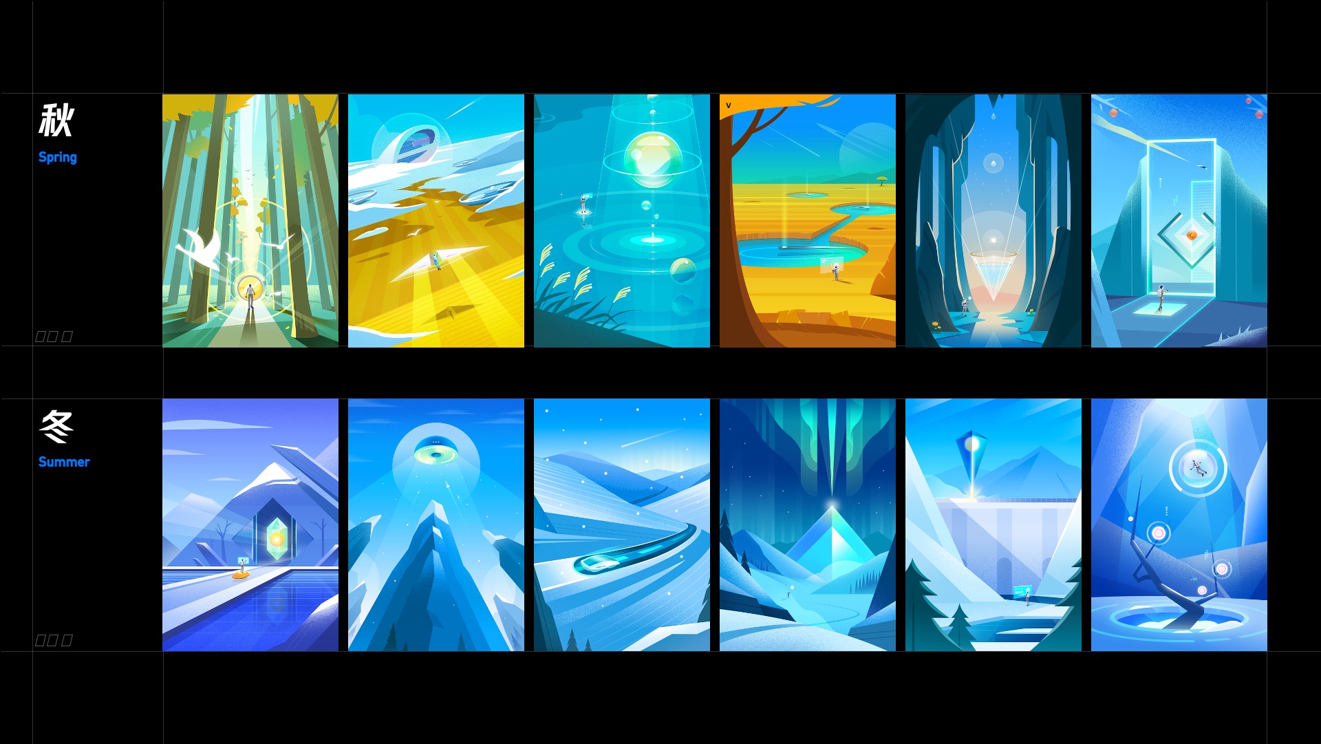 世界观和故事确定后,我们就在思考什么样的画面让科技感与节气相互融合。首先,我们根据新科技轻快净的品牌调性,搜集了大量的情绪板,将其分为科幻场景和自然场景两类。其次,我们将其中常见的科幻场景提炼出了三大特性:神秘的氛围,充满未来感的科技,突破常理的画面构图。对自然类的插画作品也提炼了三大特性:舒适的气氛,清新的自然感受,细腻的色彩。按照元素特点进行区分,科技感的元素往往拥有较为光滑的质感,因为可以使人联想到玻璃、金属的材质,在外形上拥有平滑的直线,在构成形式上有着比较明确的规律,比如平行、垂直、对称等,给人一种理性的感觉。而在自然界的生物往往造型是较为复杂多变、有生命力的、不存在绝对的直线和几何形体,而绘制科技感的节气需要将科技的理性造型搭配与变化丰富的自然元素相结合。