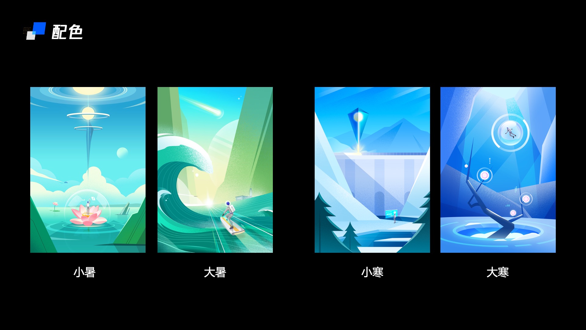 为了使各个节气表现出自己的特色,我针对节气变化中的冷暖,定义了四种区间颜色,并且使整体处于一个和谐的过渡状态。同时我把颜色控制在了一个舒适区,不能太冷也不能太热。根据调查,在夏季最热的两个节气,小暑和大暑中,人们更希望获得清凉舒适的视觉体验。因此控制了绿色和蓝色的比重,使色彩感受舒适。在冬天最冷的节气小寒和大寒中也适当的加入阳光和花朵的色彩,让人感受到希望。