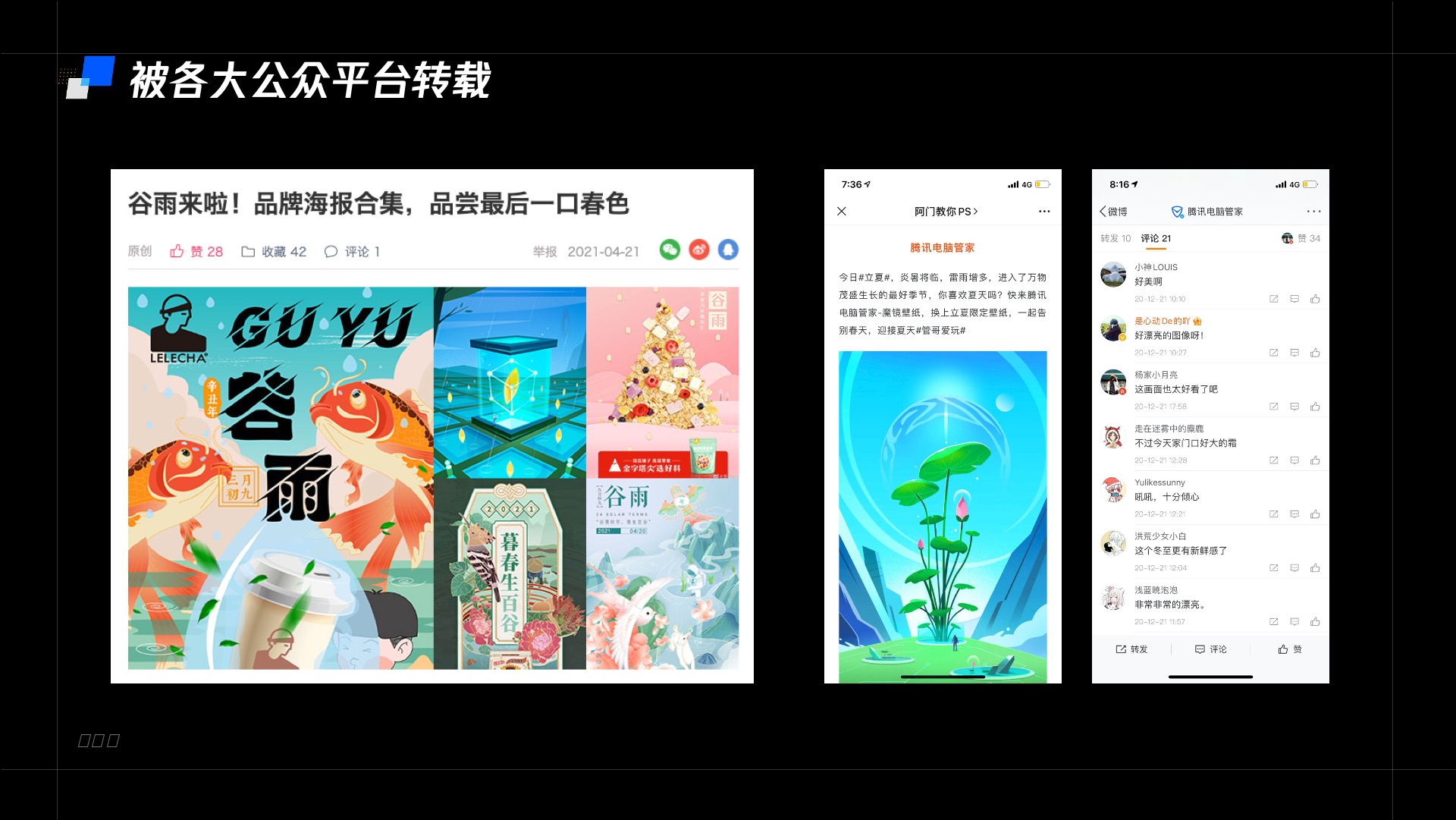 节气插画一经推出就就好评不断,被许多公众号和网站转载,几乎每一张都被数英网收录在节气营销海报的文章之中,让电脑管家的品牌获得了更多的曝光。