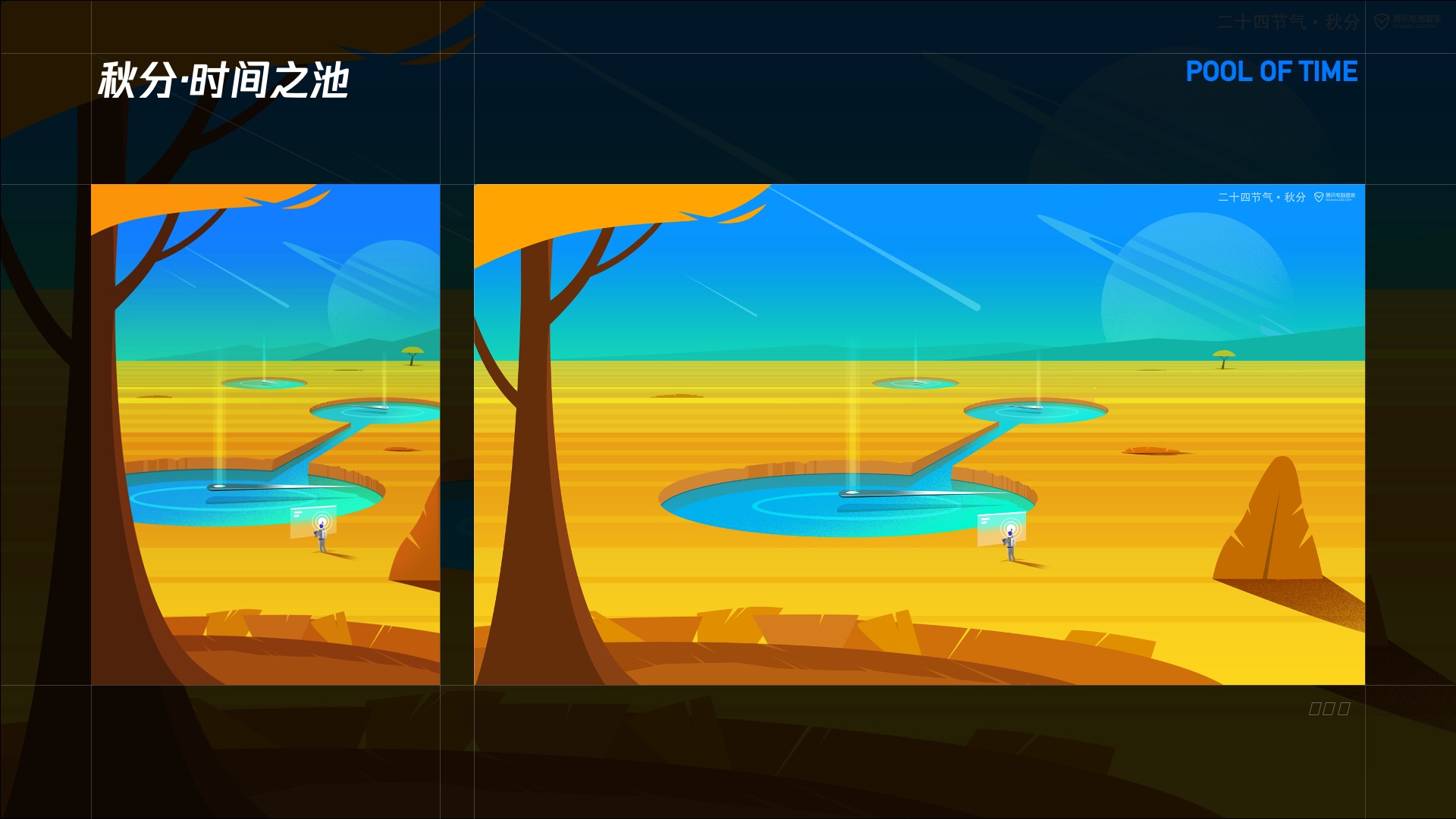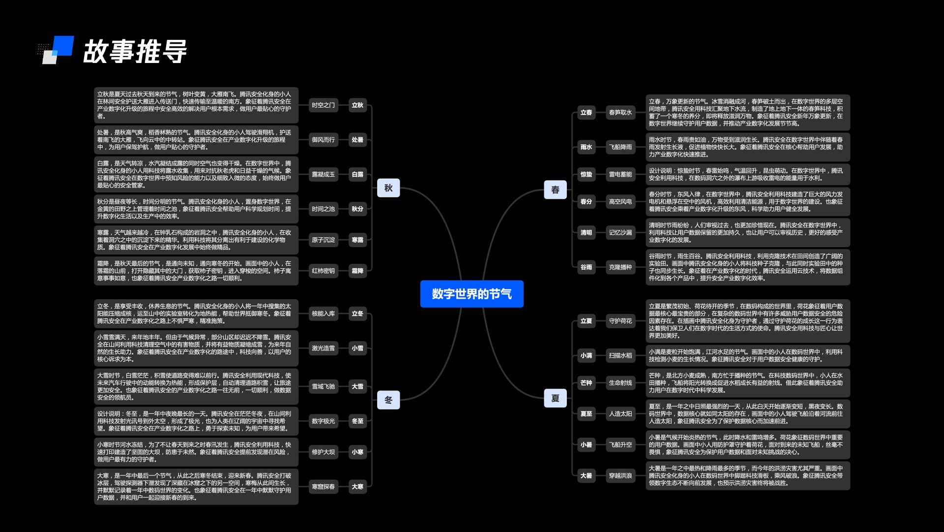 接下来的每个节气,我都选取最能代表这个节气的特性,,和腾讯安全在产业互联网中助力发展的概念相结合,比如芒种”飞船用生命射线助力水稻生长“,夏至“驾船去维护人造太阳”,秋分“管理时间的池塘来提高效率”,谷雨“通过克隆的方式帮助作物同步生长”等等。