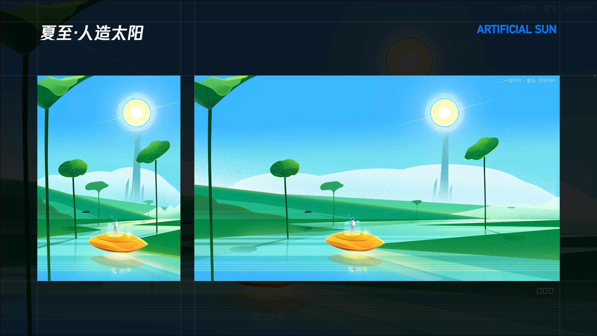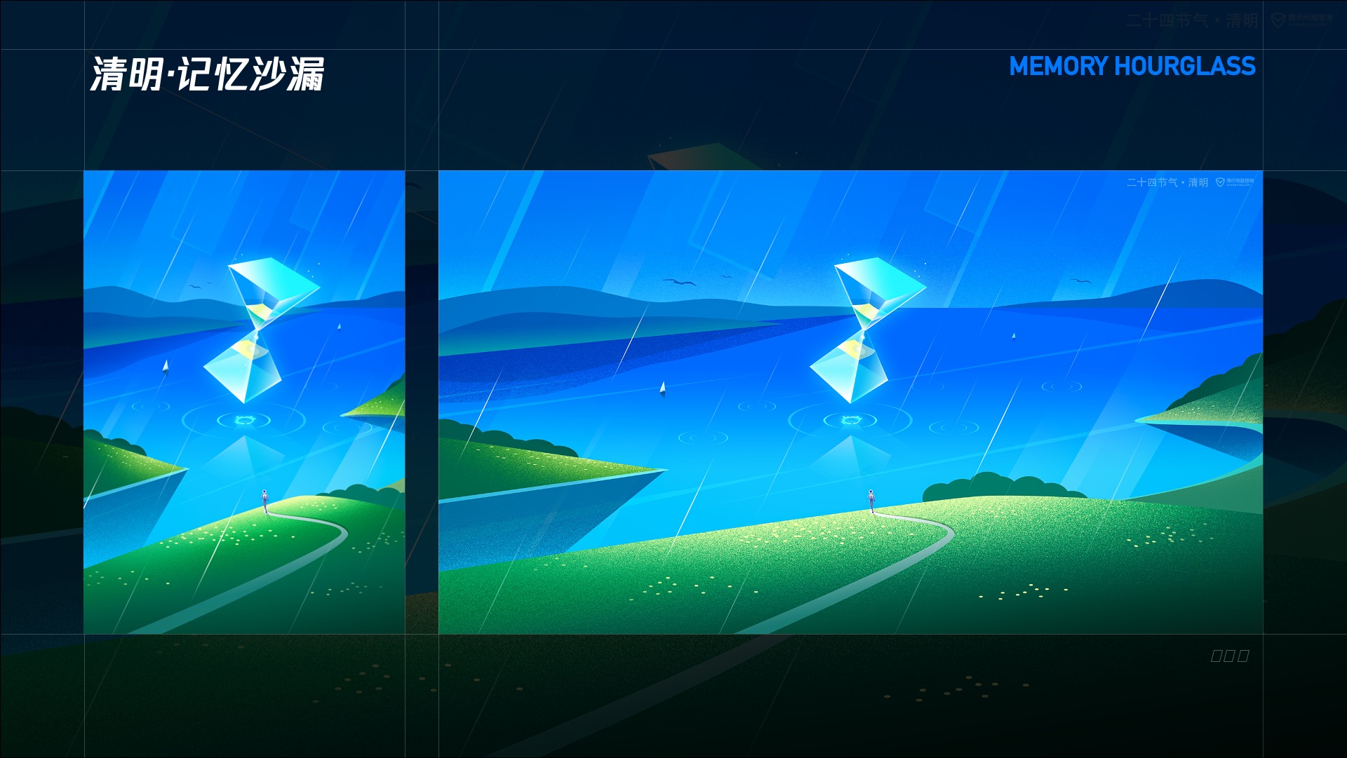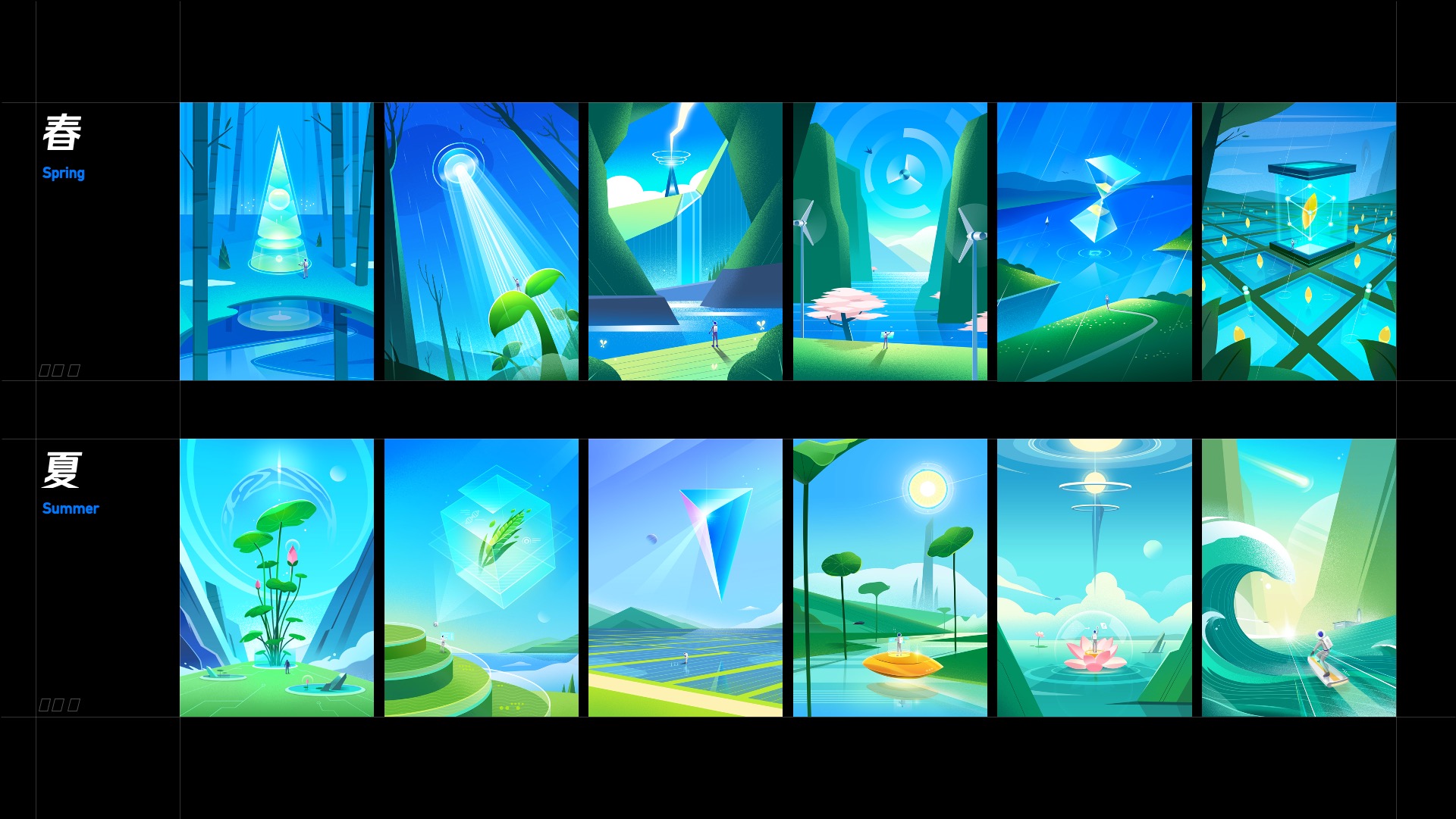 这次的节气插画与其他品牌的营销插画风格大不相同,在创作思路以及构成形式上都较难找到近似的参考。此外,在创作思路上,所有的节气都要在其中发现痛点,思考如何通过科技来使其变美好。在构成形式上,几何化的构成如何在24节气中使用统一的构成语言而又不死板,表现每个节气不同的气质。而这些问题最终都被我们逐一突破,使节气插画的设计多了一种可能性。也让我们领悟到未来元素与传统故事包含共通点,以叙事性的手法作为桥梁将元素间的内在联系打通,可以帮助我们在传统的基础上实现新风格的构建。