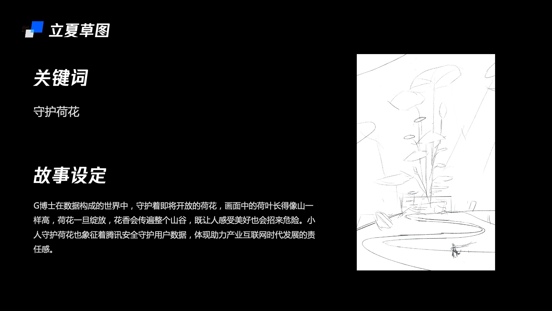 第一张节气插画是从立夏开始的,提起立夏,我们第一反应这是繁茂初始,荷花待开的季节。想到的诗句是“小荷才露尖尖角,早有蜻蜓立上头”,荷花象征着纯净与美好,也象征着富有生命的夏季已经到来,一切都是希望,就像产业互联网时代的到来。为此我针对腾讯安全保护用户数据的使命,设计了一个开端故事。腾讯安全化身的小人在数据世界中,守护着即将开放的荷花,画面中荷叶长得像山一样高,荷花一旦绽放,花香会传遍整个山谷,让人感受美好的同时也会招来危险。这也象征着腾讯安全守护用户数据,助力产业互联网时代发展的责任感。