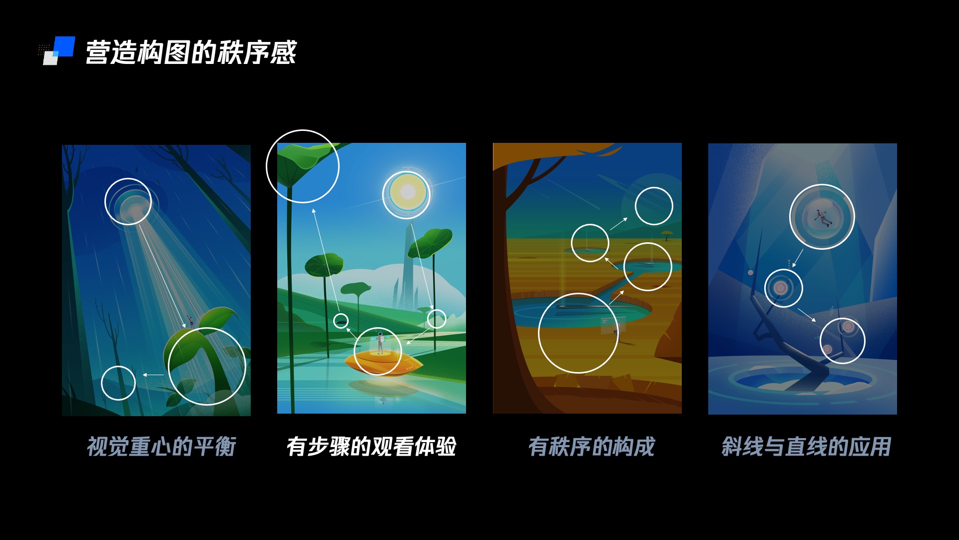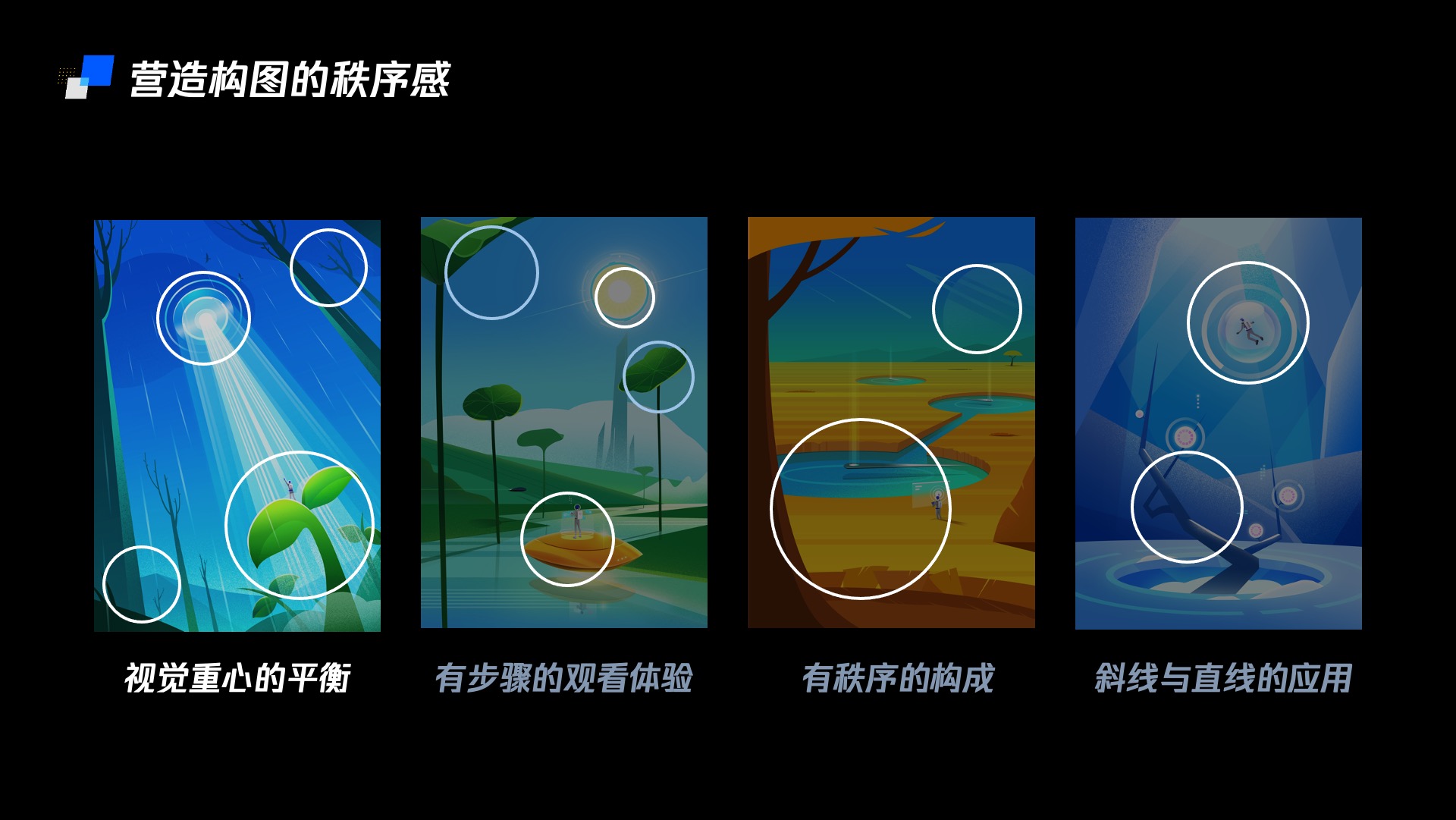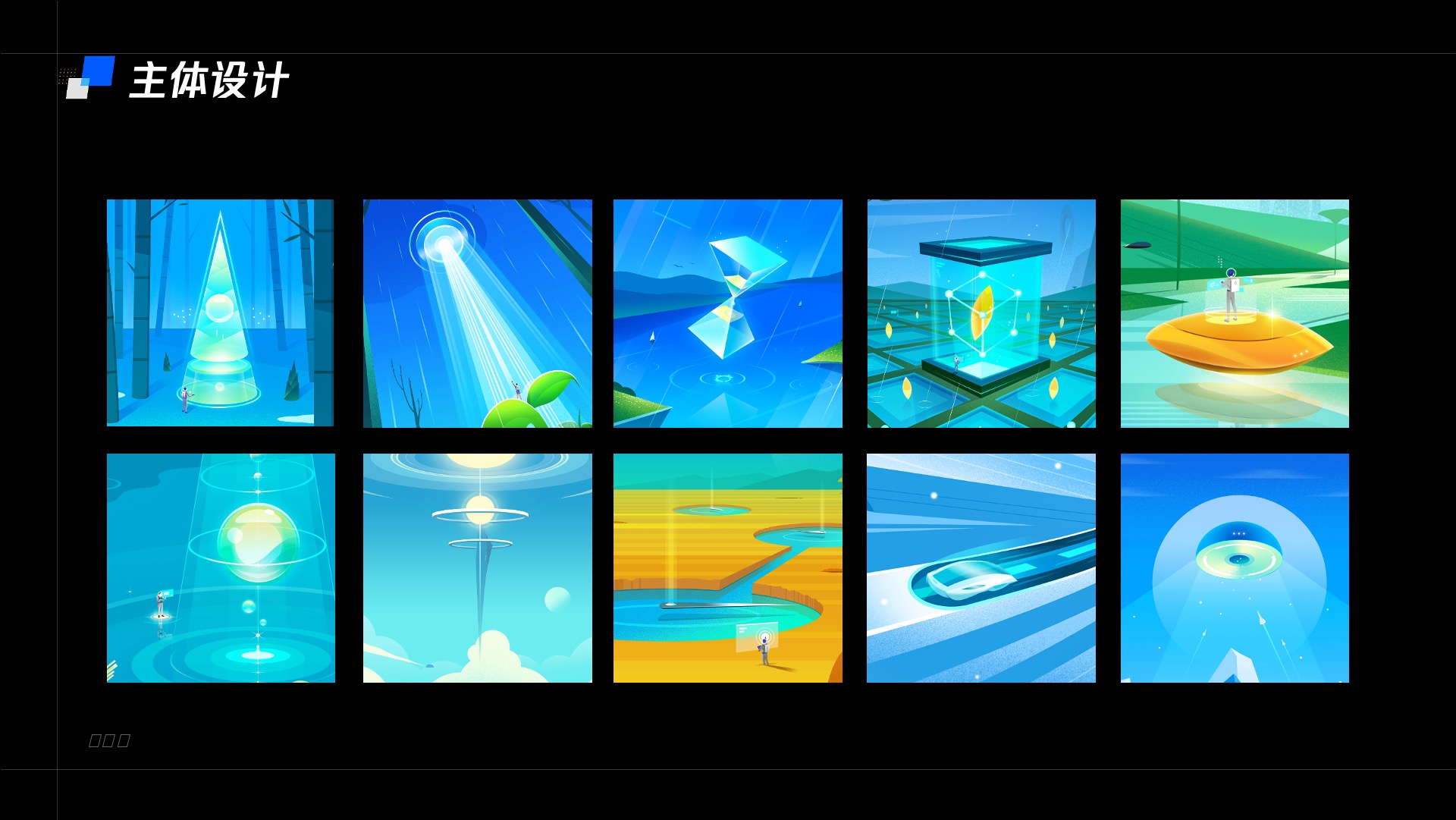 (1)视觉重心的平衡:视觉重心的平衡这一点在平面设计中经常用到,在科技感插画中往往会有为了表现重力的失衡做出漂浮的物体,但没有重力不代表视觉重心的失衡。在这一点上在插画上采用中心构图,对角线构图,之字型构图几种。既考虑作为壁纸插画时的布局,也考虑作为tips时预留的文字位置。