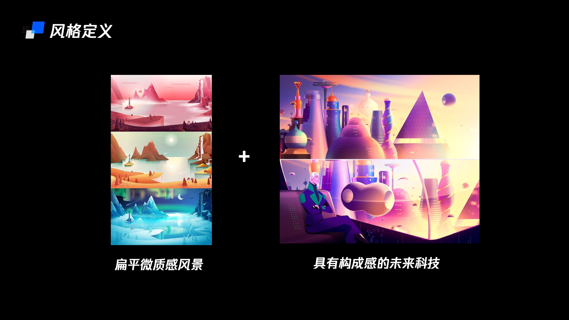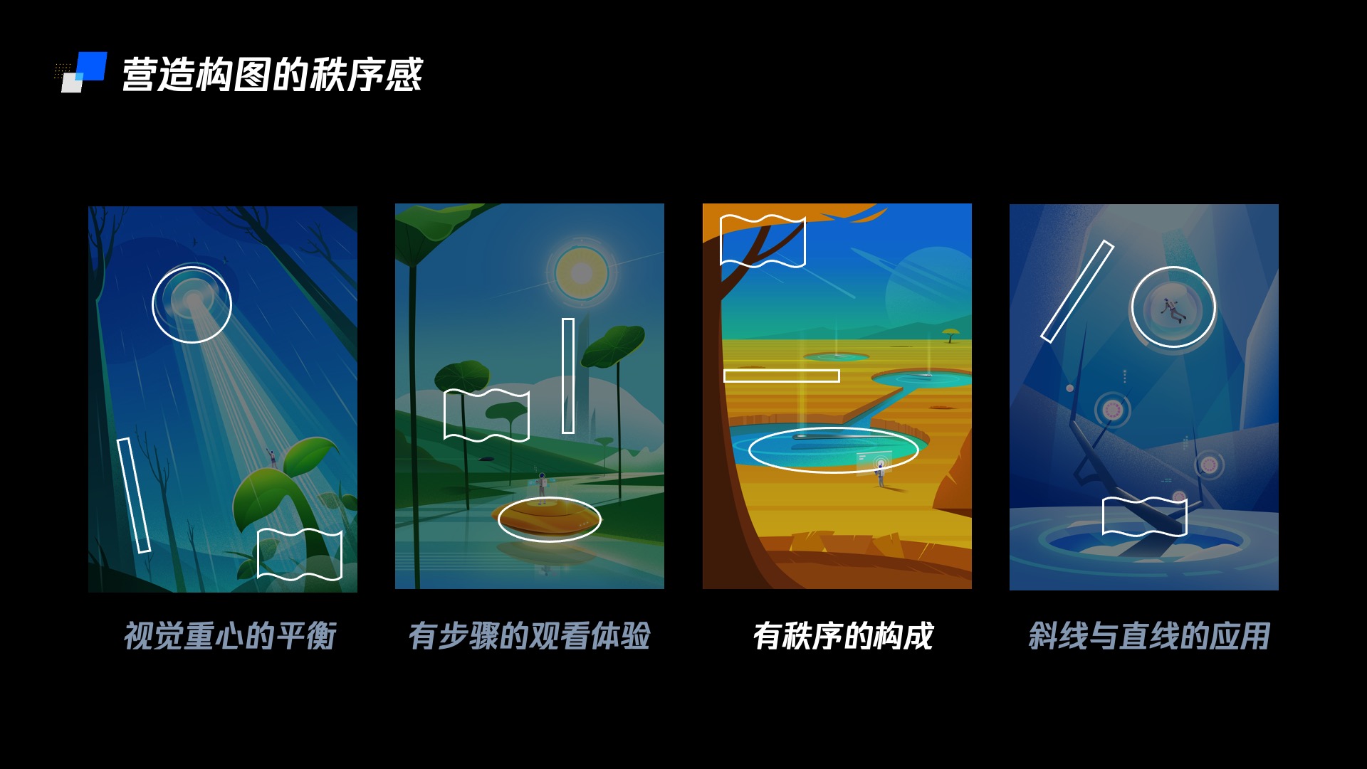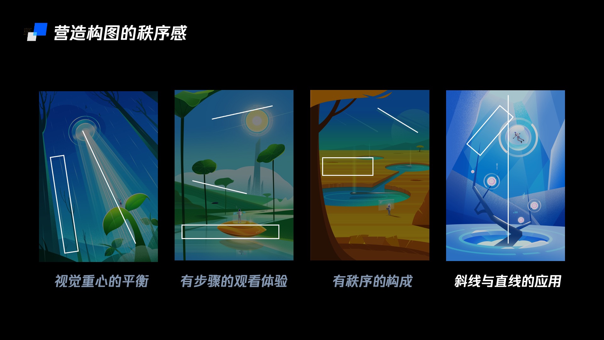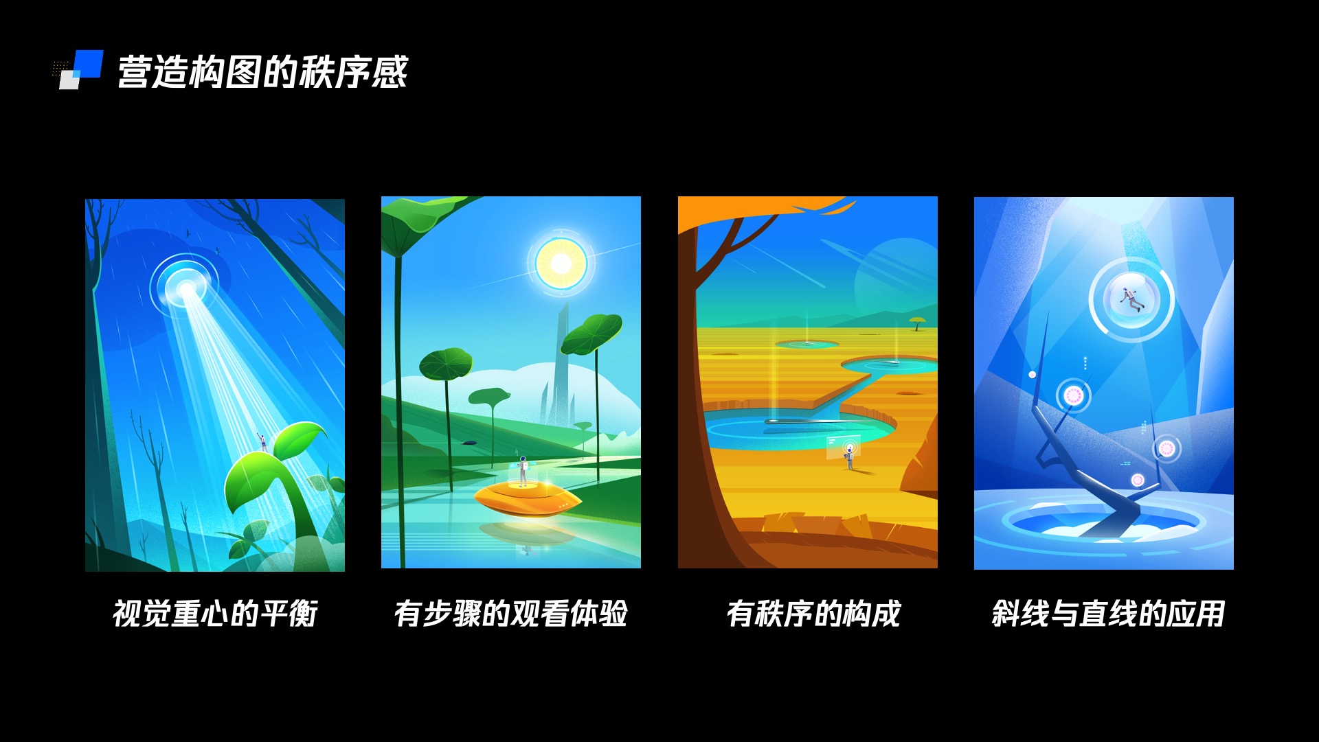 通过以上四种理性的组合方式,可以使的画面构成感强烈,画面视野开阔,节奏丰富又不失秩序感。同样的组成方式可以应用在任何一种科技感插画之中。