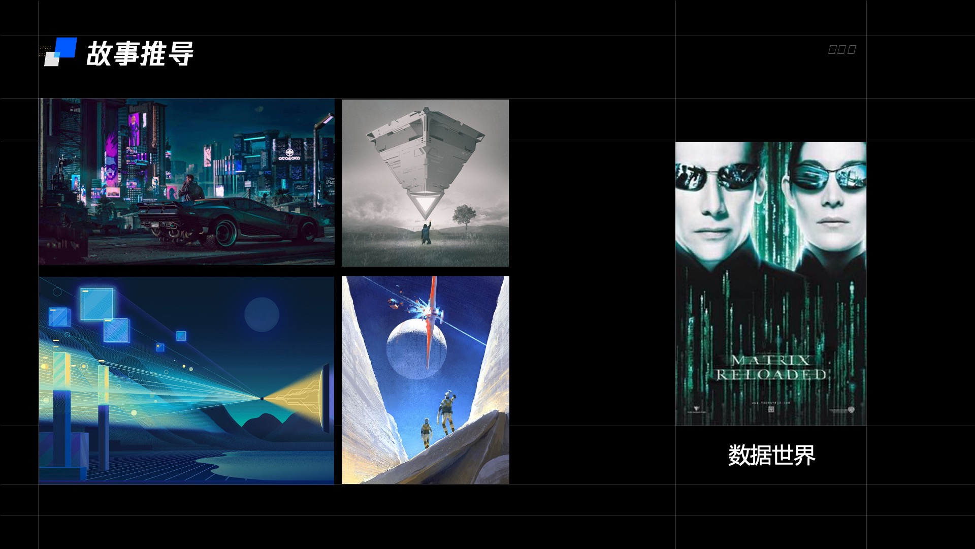以关键词为基础我们开始发散思考,怎样的世界才能将节气和科技更好的结合,为此我们也查找了许多科幻电影世界观的资料。节气有非常强的自然属性,但在大部分的科幻电影中,自然属性往往是次于科技概念的。因此,我们为此尝试设计了许多不同的概念,从科技城市中的自然景观,到守护世界的科技神兽。这些概念虽然在视觉效果上可以做到科技感十足,但与自然场景的结合都显得较为生硬,或者过于复杂与就在我们感到灵感枯竭之时,突然想到小时候看过的电影黑客帝国,黑客帝国描写下的世界是一个由虚拟数据构成的世界,那里一切现实场景都是数据构成的,就像我们现在丰富多彩的网络世界,具象的机械科技元素和丰富的由数据构成的自然元素在这样的世界观下显得非常和谐,腾讯安全业务的主战场从C端转向B端也类似于数据世界开启了新的探索。
