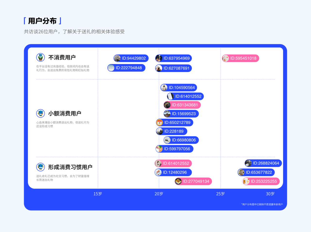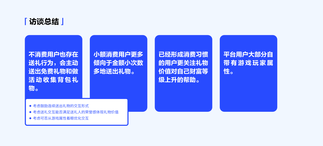 对于产品体验的调整,我们团队决定着眼于用户,从用户的角度发掘体验优化的痛点和机会点。我们聚焦平台内主要用户群体的送礼场景进行了定性访谈,分析用户在送礼过程中的关注点,探索优化送礼交互。