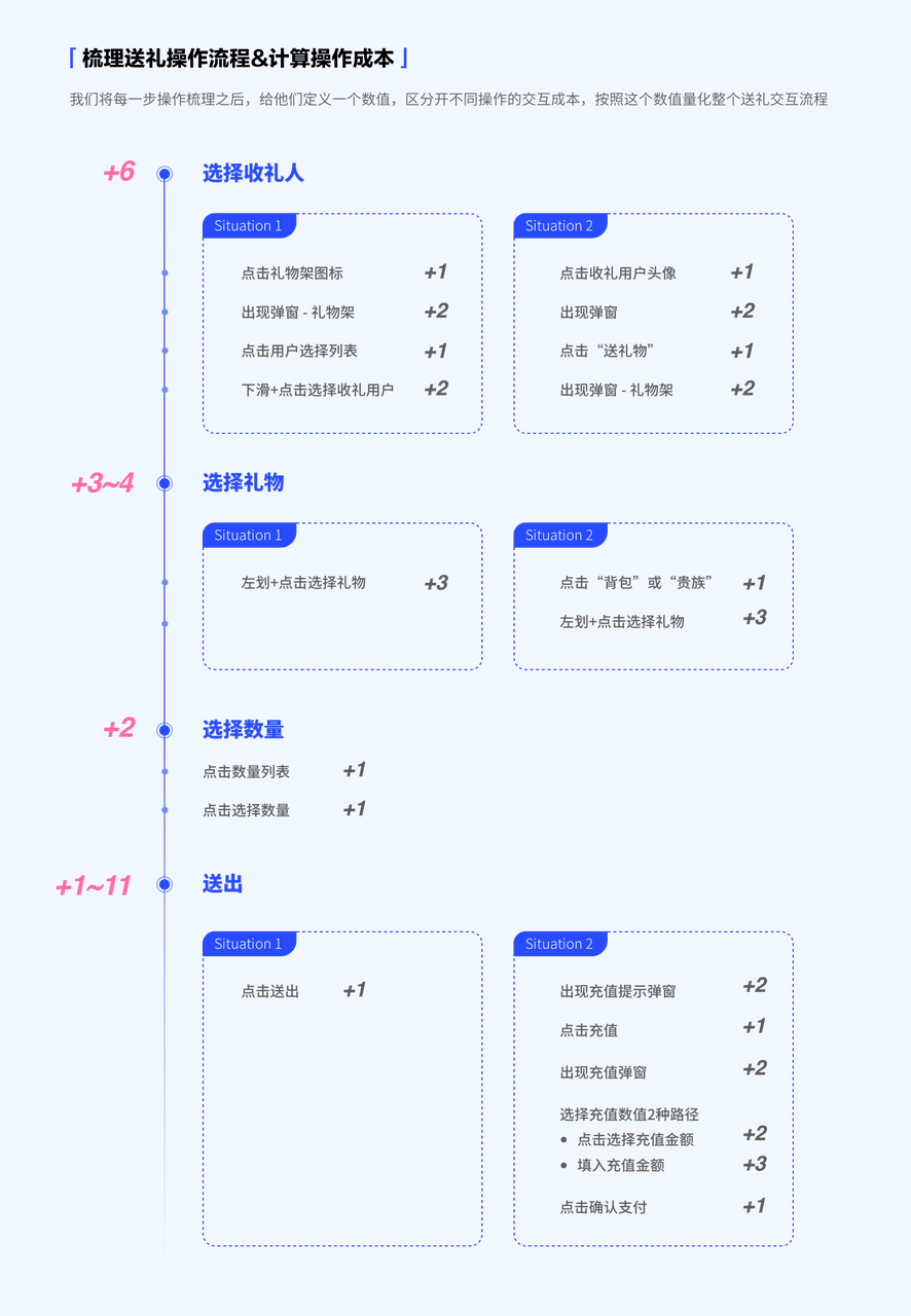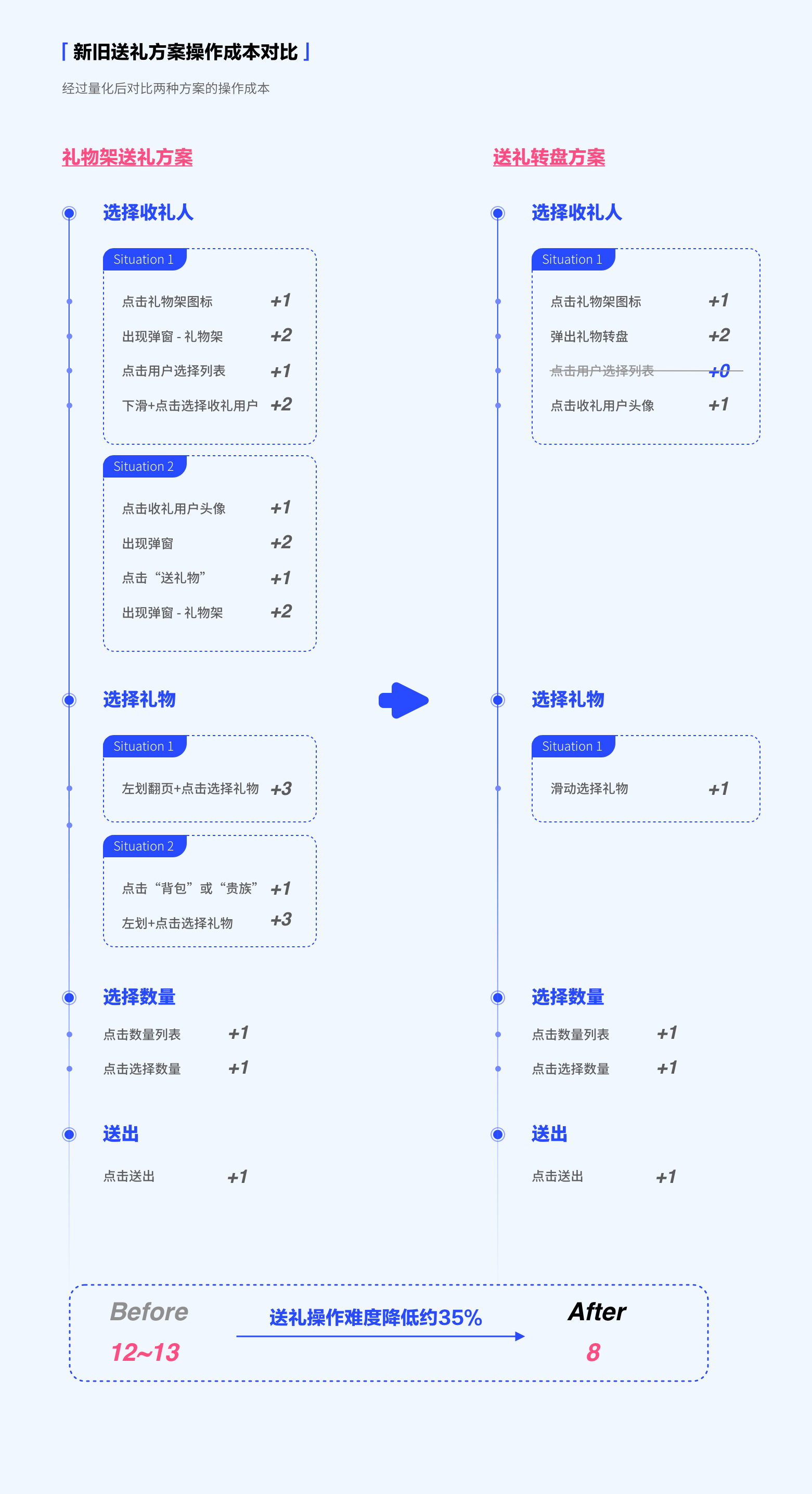 常规的送礼操作流程本质上没有脱离表单填写的框架,跳出惯性思维后我们可以量化对比出新方案的用户操作成本有了大幅度下降。