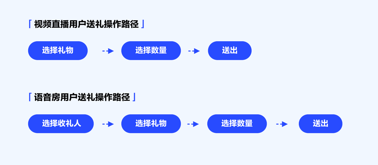 对于视频直播,直播间内用户与主播的互动模式是一对一的,一个直播间只有一个送礼出口,送礼行为中不存在选择的过程。