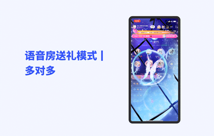 而语音房的互动模式则复杂得多。房间中同时存在9个麦位,主播和用户都能在麦位上互动,送礼行为是多对多的。在送礼行为上,用户只存在【麦上】与【麦下】两种概念的区别,房间内的所有用户都能给任意【麦上】用户送出礼物。