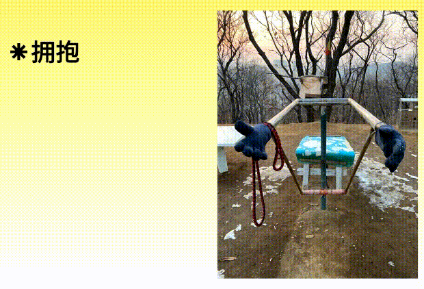 它给我的感觉像是一个人张开双臂想要拥抱,所以当时就随手拍了下来,而根据拥抱的印象,又联想到了爱,以及和平。所以就打算“抄袭”这个画面去设计一个以拥抱为主题的海报。当然“抄袭”并非要全部照搬,这里只是选择性的提取了这个画面中认为的亮点,也就是两个手套。