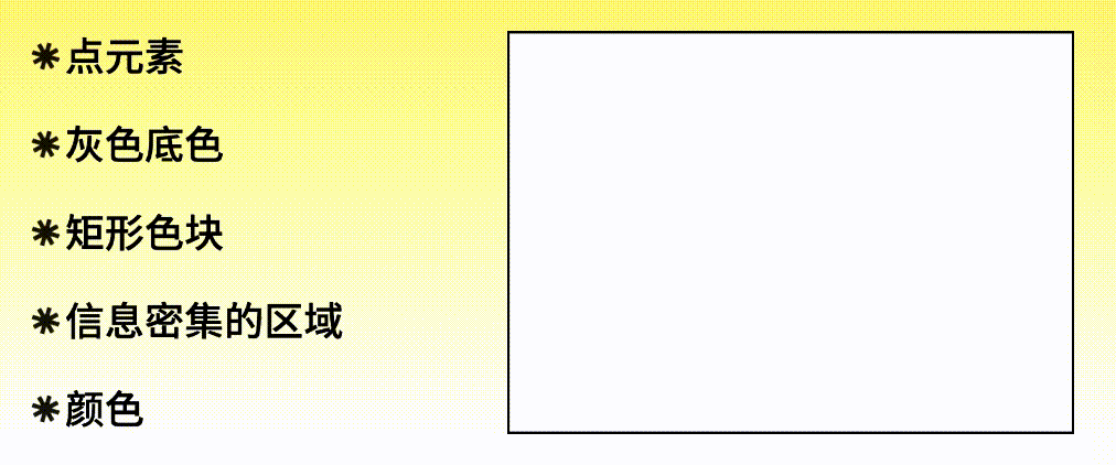 我们先来分解一下这款收音机的设计中有哪些可见的元素,分解的过程中也要动脑思考,这些元素都能用在什么地方?首先左侧有密集的点元素区域,点元素可以作为平面设计中的强调连接和图形化的功能。灰色的底色,这里就可以直接当做背景色使用。矩形色块可以用来置入图片或者压住版面。下方信息密集的区域对应到平面设计中可以用来编排文字。最后还有两个颜色,可以用来强调突出重点。
