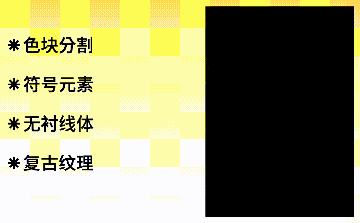 使用这些特点设计海报,首先是色块分割,还可以在这个基础上延伸一些,小的色块让画面更具变化性,添加无衬线字体,当然不是所有无衬线的字体都可以,一定要找笔画特点是有复古的感觉的。最后就是添加一些小元素和一个复古的纹理就可以了。