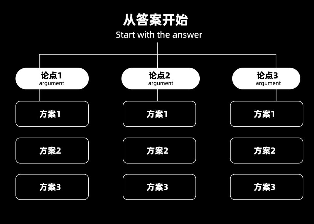 按照金字塔原则,我们在表达一个观点时候-先从答案开始,当你主管提出一个问题时,你的回复应该是「我们应该做某事」,观点非常直接明了,只有这样,在你抛出答案后,我们才能提出对应这样做的理由。