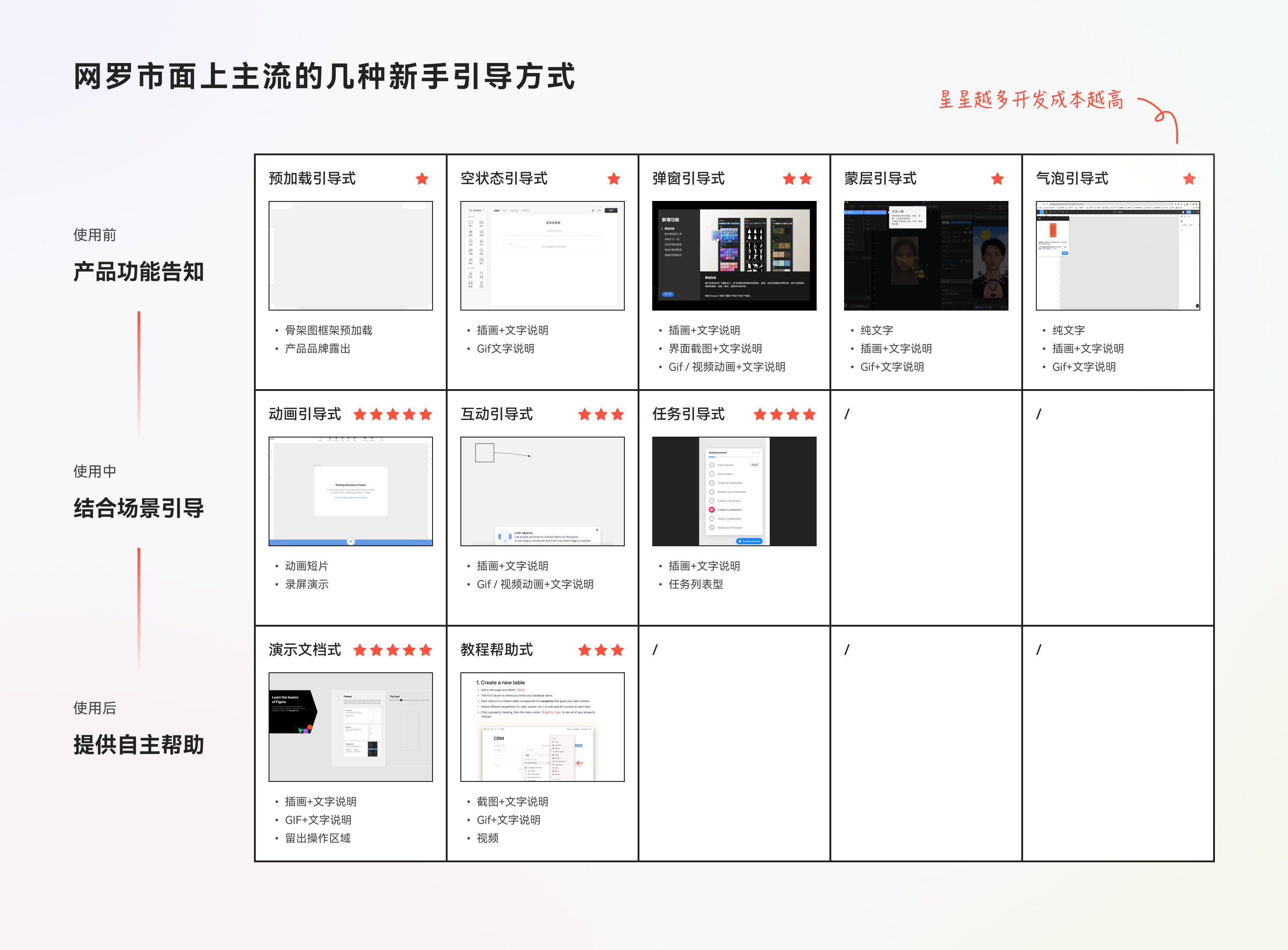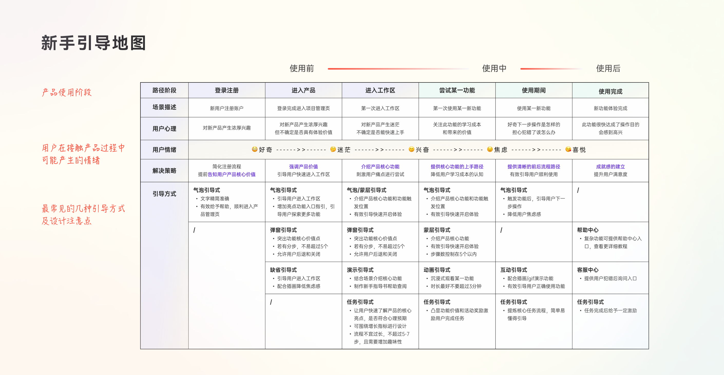 新手引导地图主要根据用户使用产品前中后流程中的场景推荐较为合适的引导方式,具体的新手引导方式的选择和表现形式,可以结合实际团队的开发资源和新手引导目标进行选择,这块后续会结合墨刀设计工具新手引导项目进行说明。