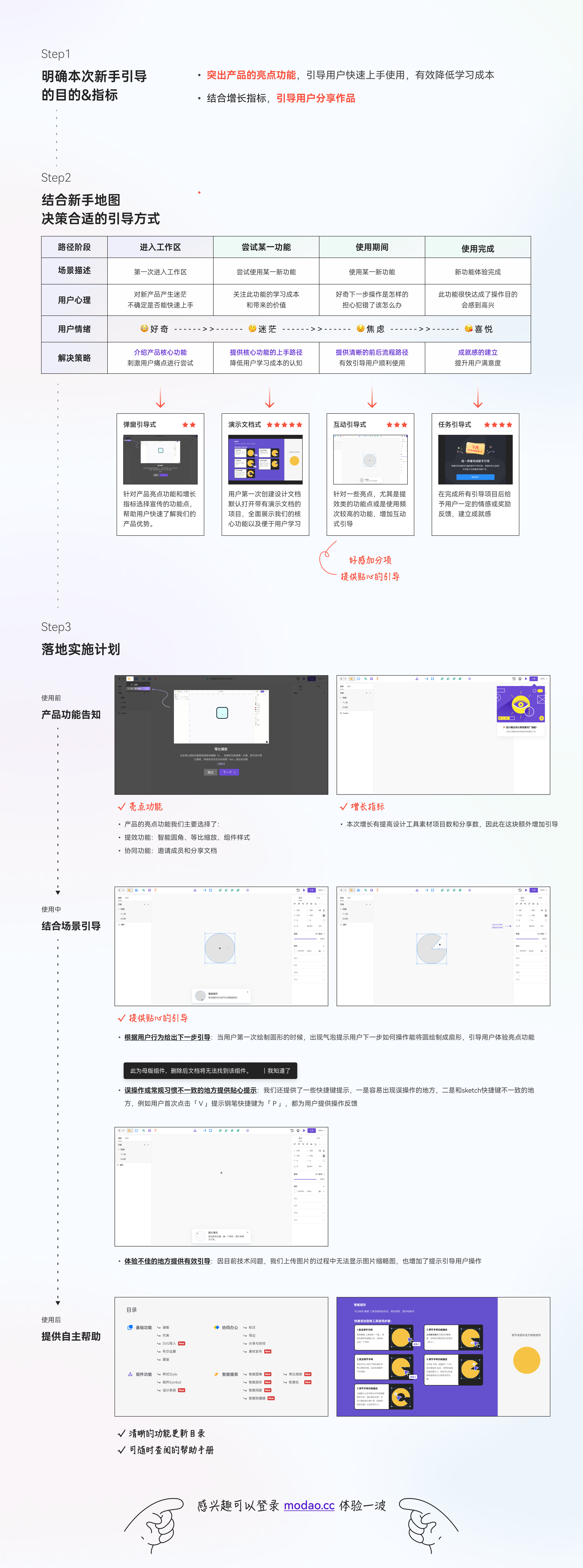 墨刀这款设计工具属于初创期产品,目前没有什么设计用户,所以我们整个的引导方案还是以凸显目前设计工具亮点功能为主。