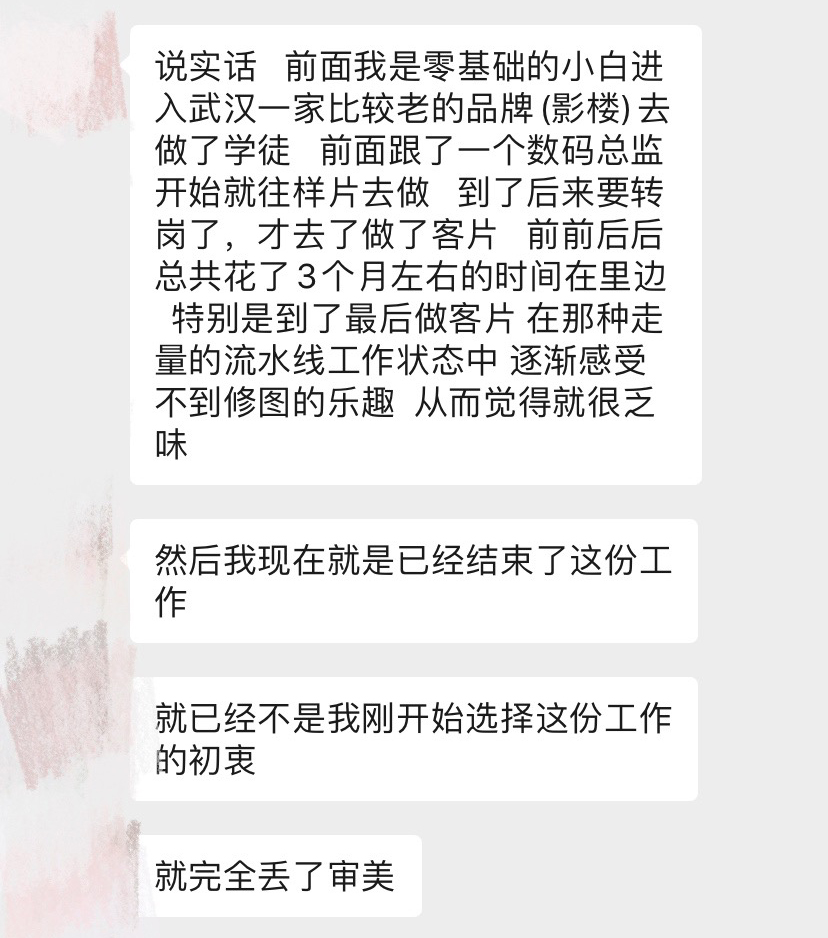 工“走量”,不仅无法感受修图之美,还容易对这份工作产生倦怠,甚至对行业产生绝望。