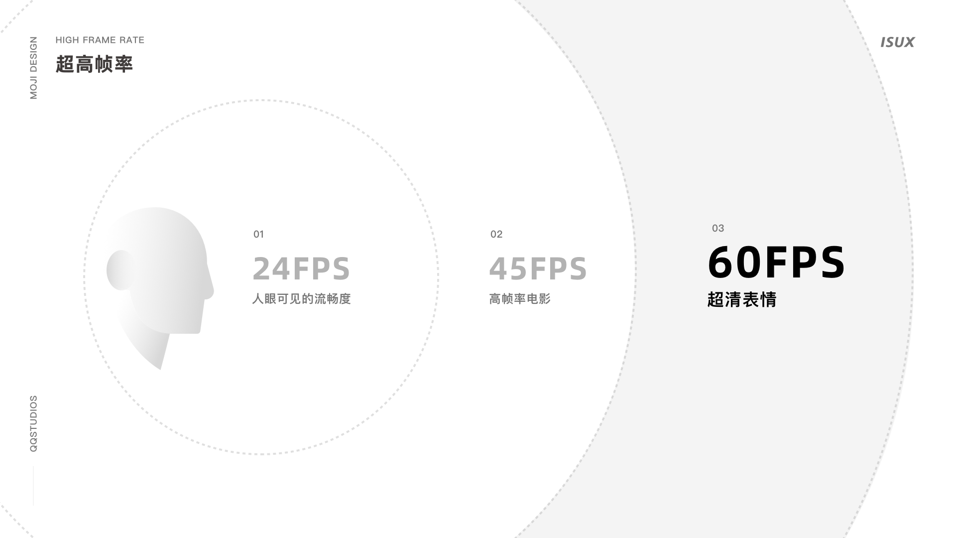 帧率即每秒传输帧数(FPS),是指每一秒传输到屏幕上的画面数。一般来说,帧率越高其画面越流畅。24FPS的电影已经达到人眼认为流畅的要求。近些年一些高帧率电影(如《霍比特人:意外之旅》)可以达到48帧/秒,其画面震撼度和清晰度都得到大大提升。而在本次QQ超清表情的设计中,我们则使用了60FPS超高帧率,意味着每秒有60张画面闪过,对于人眼来说其流畅度和动作细腻度达到无与伦比的效果。