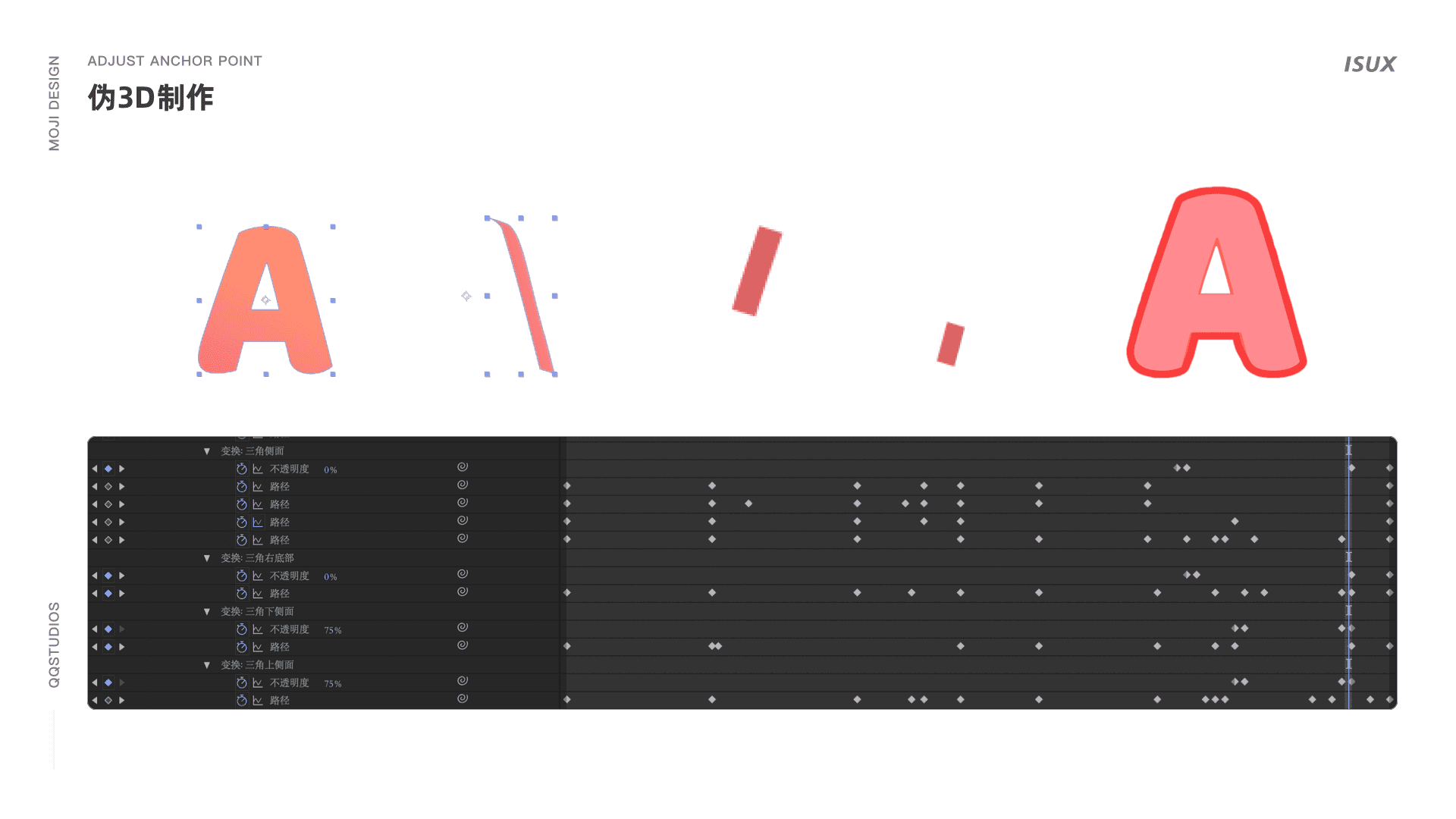 (2)逐点描摹3D运动。3D效果需要通过刻画出形状中每个面的运动轨迹,然后追踪每个面的运动路线,再复制锚点组成完整动画。为了方便描摹,设计师可使用3D图层制作好3D效果。对于更加复杂的形状和运动,也可以用3D软件进行辅助。