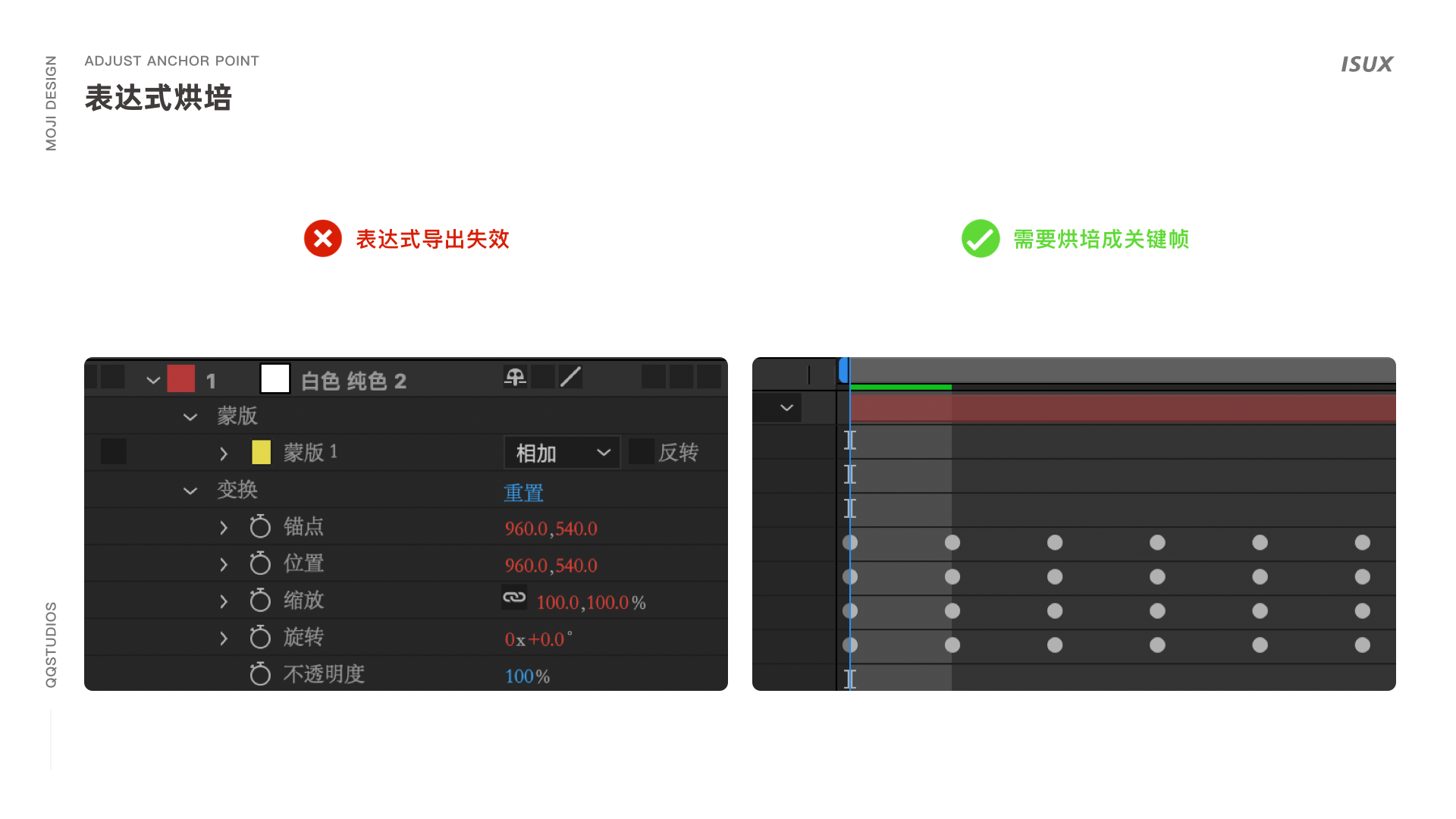 ·表达式:Lottie对表达式的支持并不全面,经常失效。可用插件将表达式烘培成关键帧后再导出