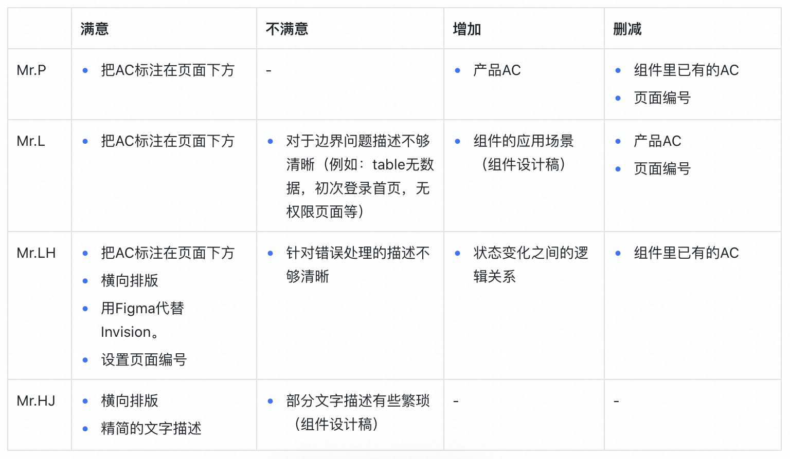 下面是我当时针对3位开发同学和1位工程Leader的调研记录:(AC=Acceptance Criteria验收标准)