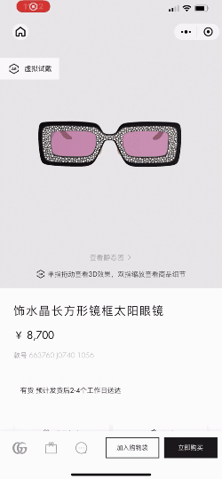Gucci古驰线上旗舰店推出了AR虚拟试戴体验,高精度商品数字化展示诠释眼镜精美细节,高效AR人脸追踪打造真实佩戴效果。用户可以随时在Web浏览器或是微信小程序进入Gucci旗舰店进行眼镜试戴,即时体验眼镜的材质和镜片在反光情况下的真实效果,还原线下购物体验。线上AR 试戴突破了时间和空间的限制,即试即买,升级消费者购物体验。