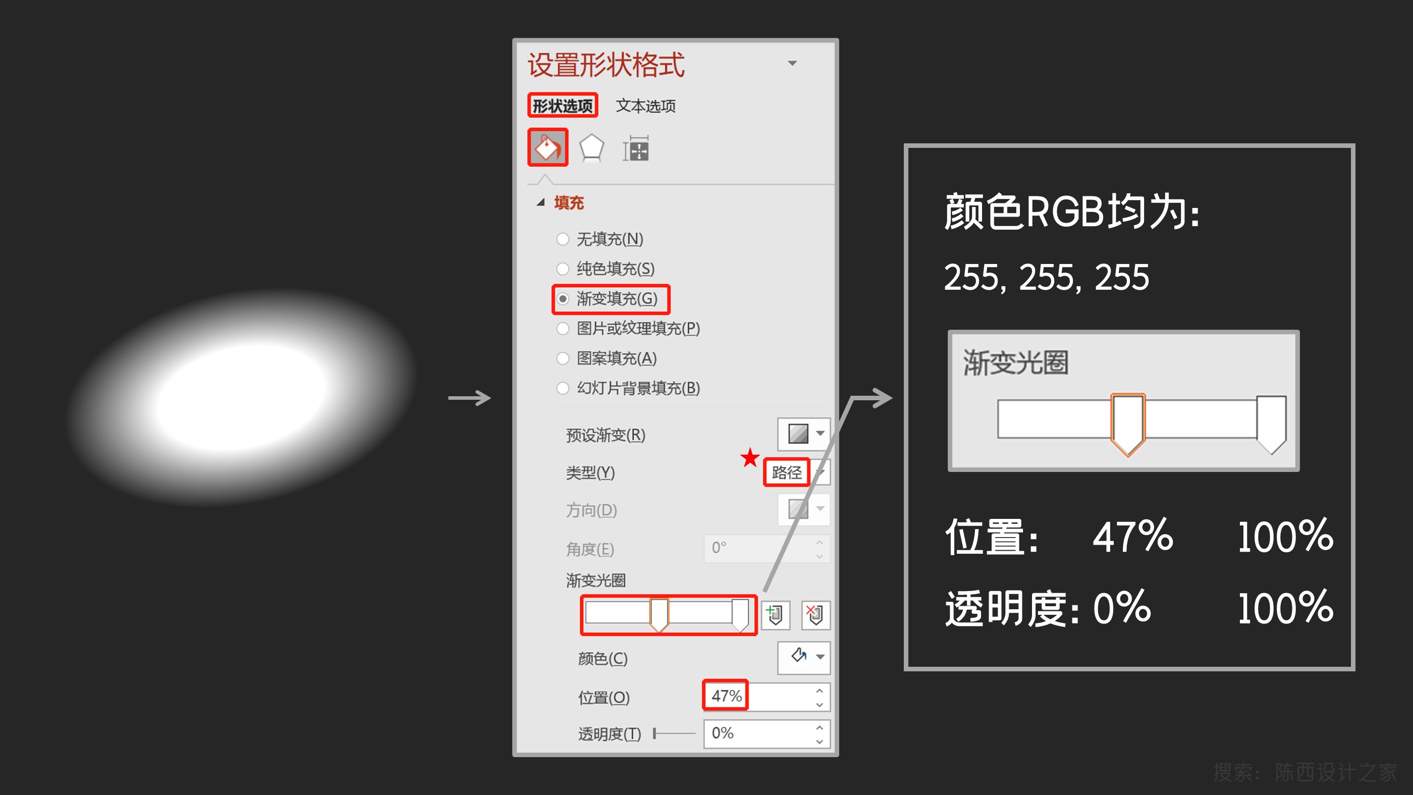 其实,这种效果是由两种渐变类型的椭圆形叠加而成的。如下: