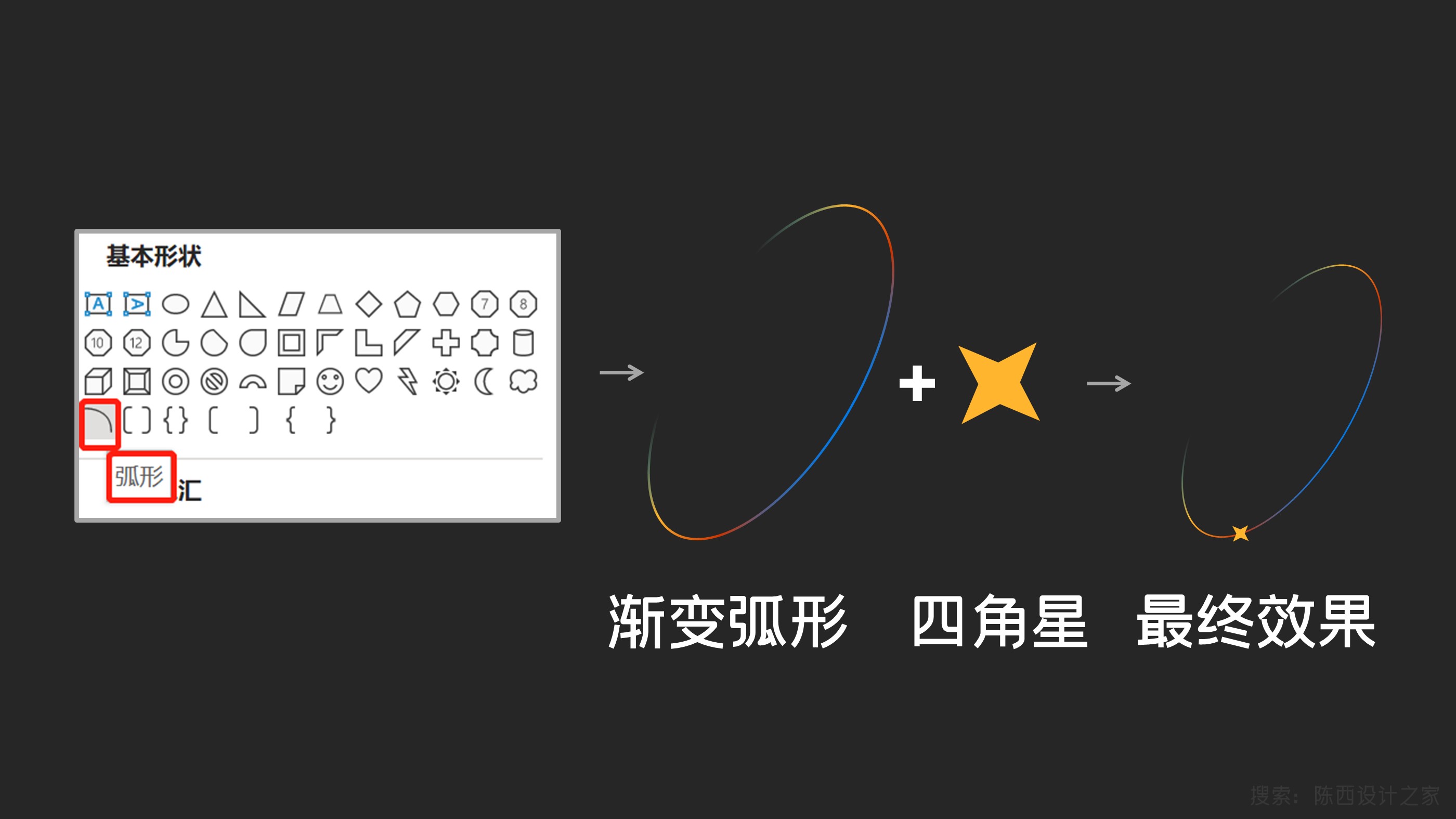 设计一个这种花里胡哨的渐变弧形,搭配一个四角星,组合成这样一种比较有创意的元素。