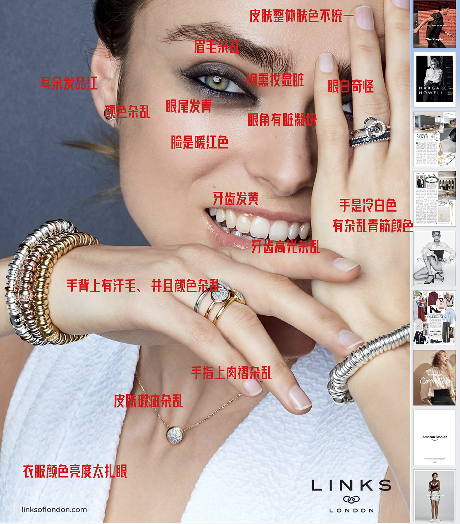 第一张照片,是英国女演员凯拉奈特利。照片上的LOGO显示是为一个叫做links的伦敦品牌拍摄的珠宝广告。大家能看出来有哪些问题么?