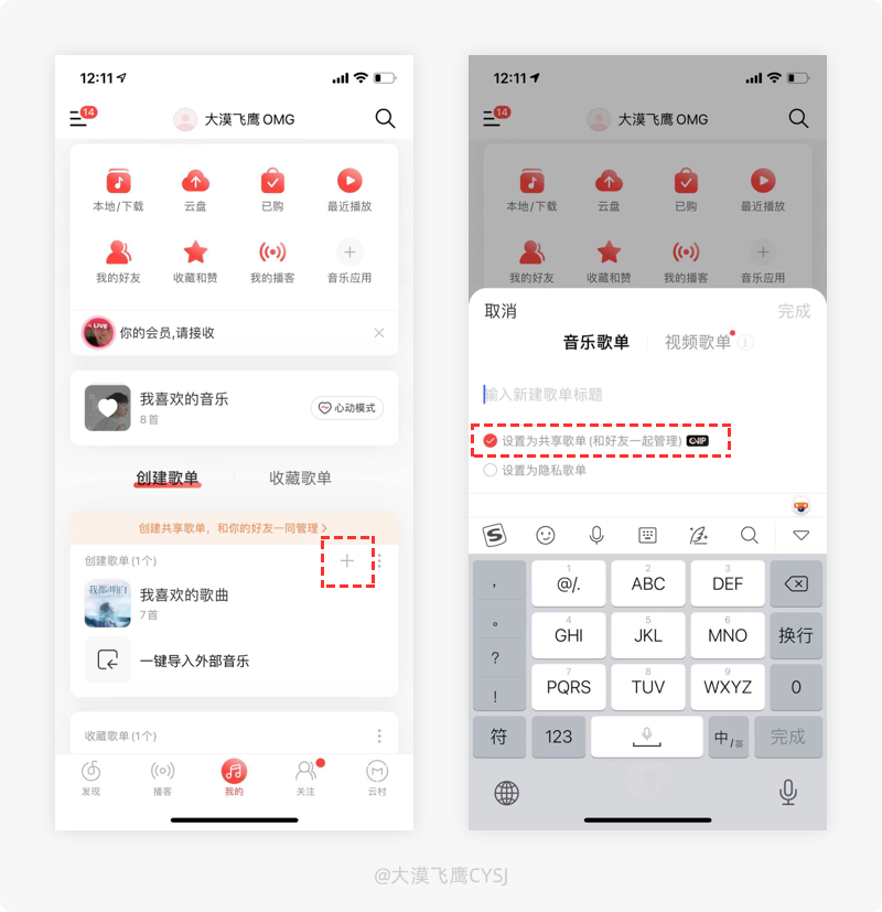 在网易云音乐“我的”页面创建歌单时,勾选“设置为共享歌单”,即可邀请好友加入、并一起管理该歌单。