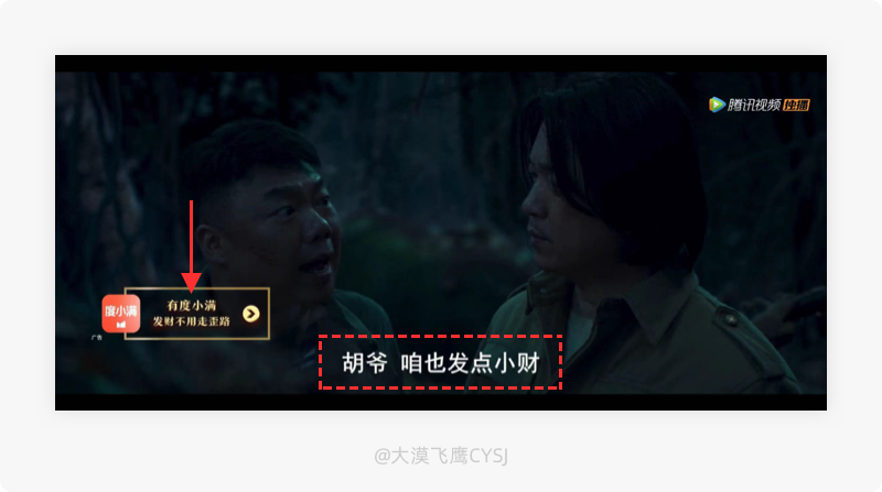 使用腾讯视频看片,当相关台词出现时,跟台词相关联的广告会从左下角无缝插入,与剧情毫无违和感。