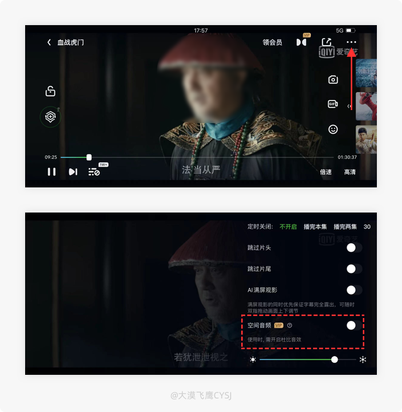 使用爱奇艺横屏看片时,可从右上角菜单中开启“空间音频”功能,它可以模拟影院的多声道音效。