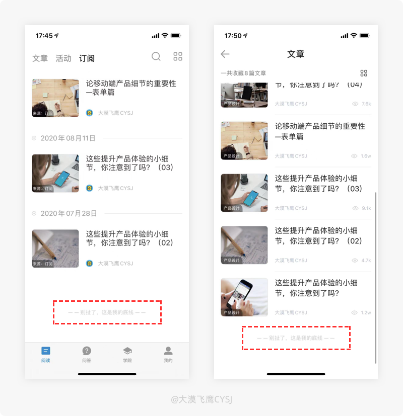 将一个页面的内容滑到底部时,继续滑动要么图标转了几圈恢复原样、要么没有任何反应,这是很多应用都在犯的低级错误,移动端的新手用户是否会想,手机卡了、还是网络不好呢?虽然有部分优秀的互联网产品关注到了这一块儿,并在页面底部也予以相应的提示告知用户已经到了页面的末尾处,但仅仅只是一个通知而已。