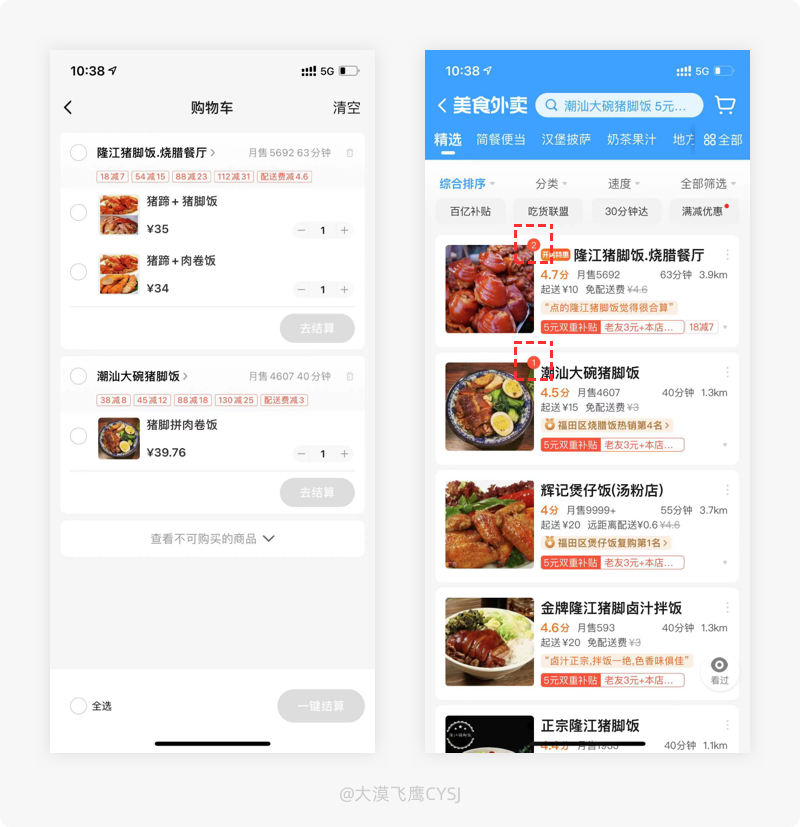 使用饿了么点餐,已加入到购物车的商品会在店铺列表中标记提示,便于用户在不同的列表刷到同一家店铺时能及时发现,快速过滤,帮助用户节省更多时间以提高点餐效率。众所周知,用户一个页面停留的时间越长、不确定性就越强,离开的可能性也就越大,产品若能辅助用户更快速的作出决策,转化率就能随之提升。