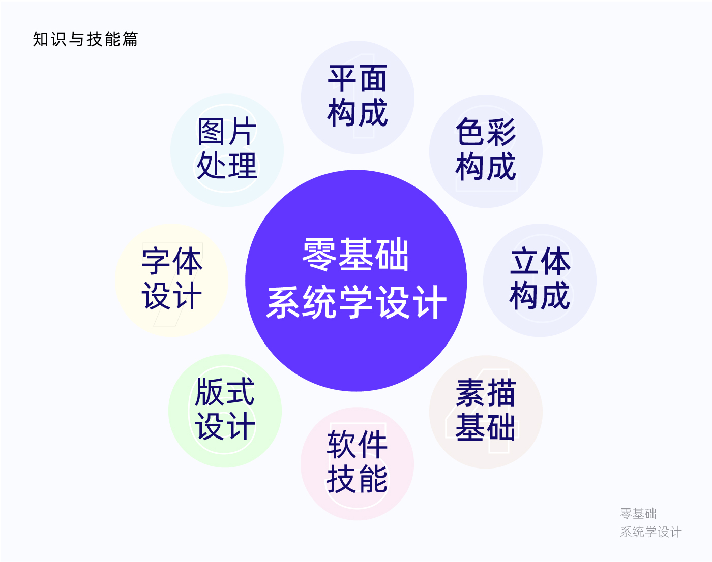 《零基础系统学设计》系列,我从多年的工作经验中总结了需要学习和掌握这8个方面的基础知识和技能,即《平面构成》、《色彩构成》、《立体构成》、《素描基础》、《软件技能》、《版式设计》、《字体设计》、《图片处理》。每个方面可以研究和学习的知识非常多,除了知识和技能,学习设计还需要掌握一些能力,比如审美能力、沟通能力等这些都非常重要,后面我会从这些方面慢慢总结和分享。
